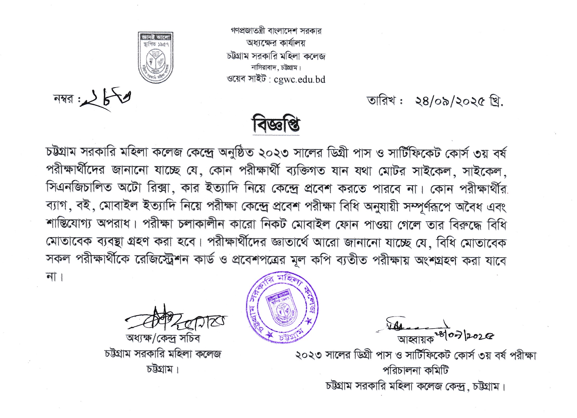 ২০২৩ সালের ডিগ্রী পাস ও সার্টিফিকেট কোর্স ৩য় বর্ষ পরীক্ষার্থীদের জ্ঞাতার্থে বিজ্ঞপ্তি