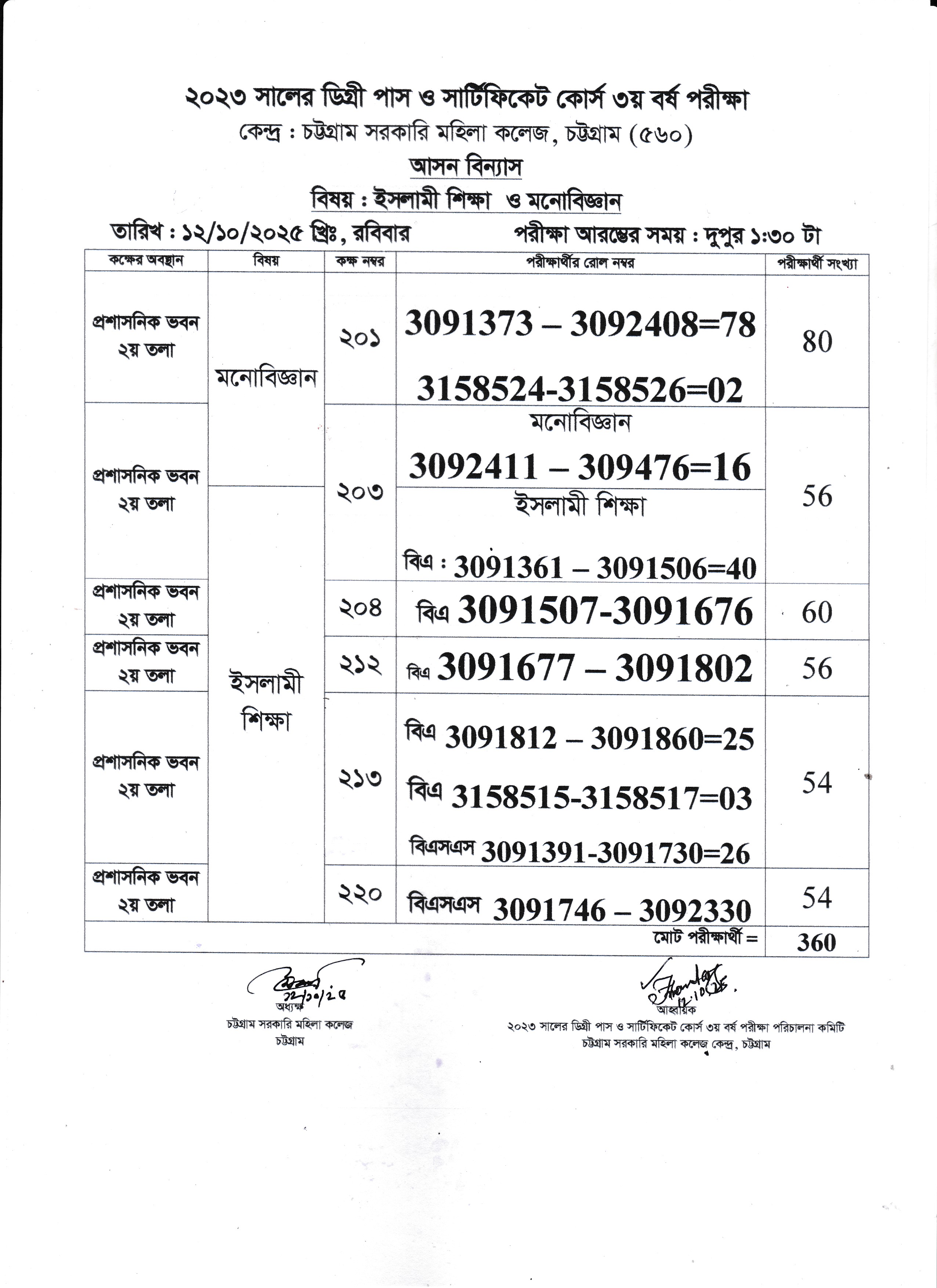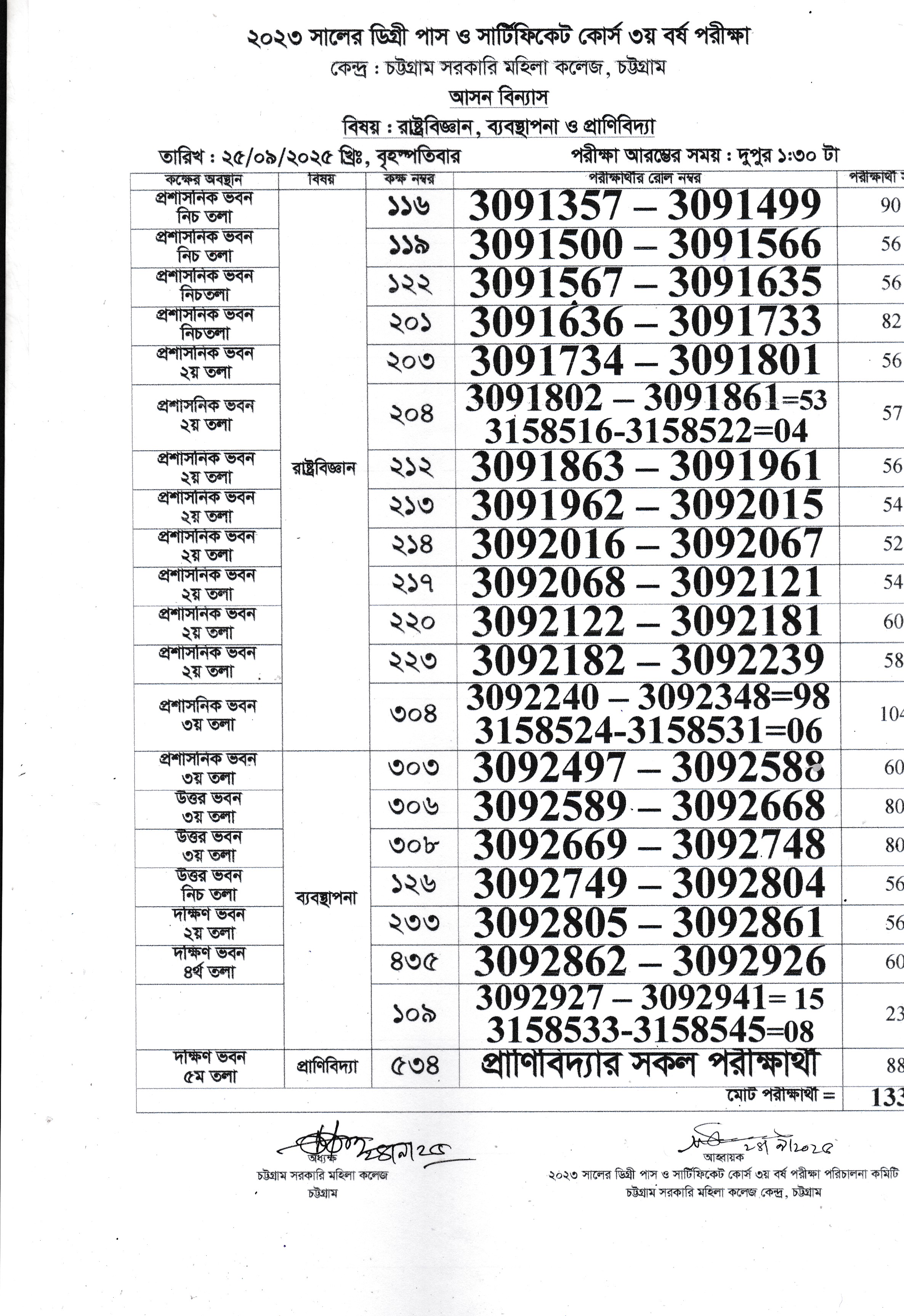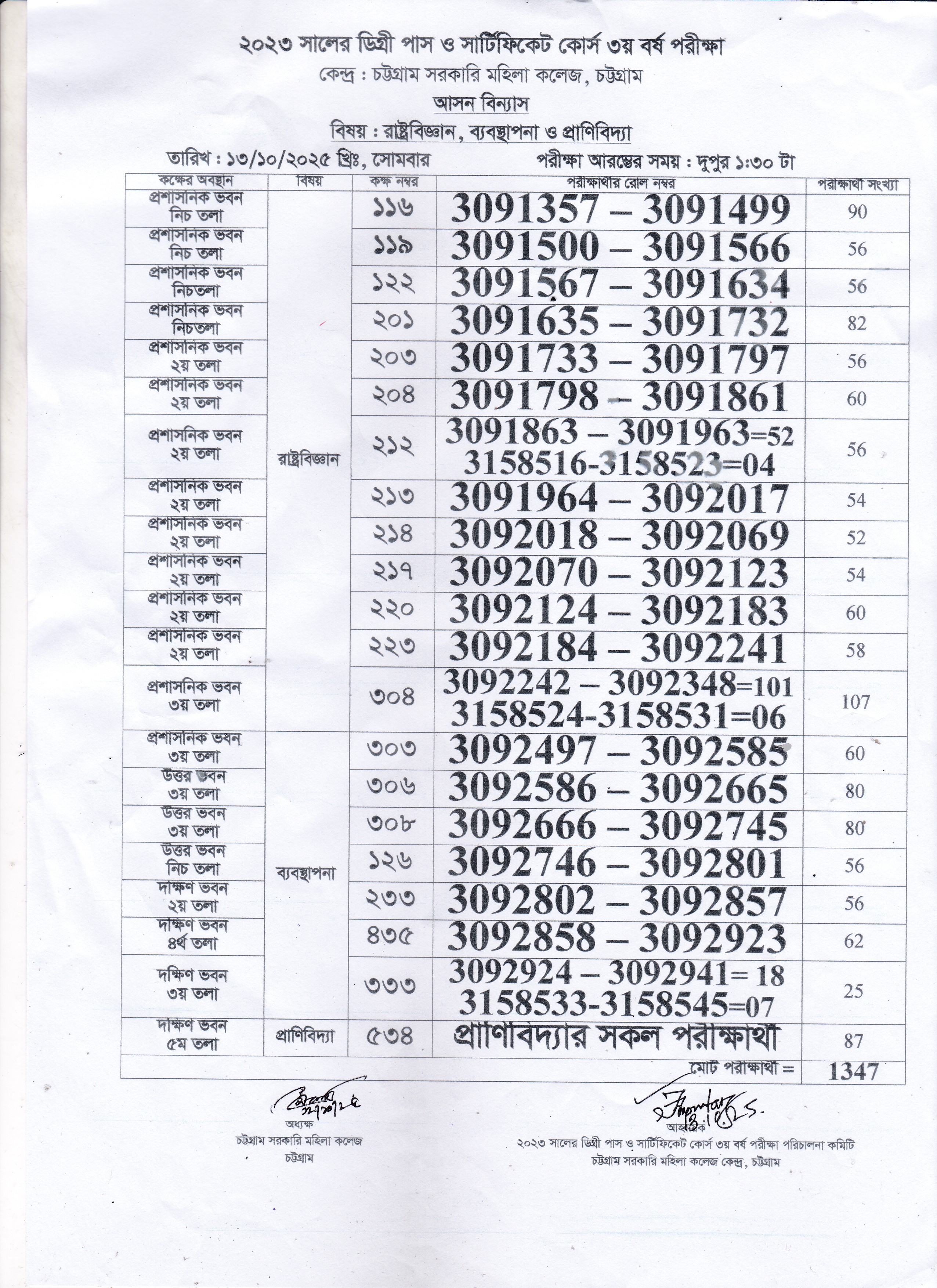 অদ্য ১২/১০/২০২৫ তারিখের ২০২৩ সালের ডিগ্রী পাস ও সার্টিফিকেট কোর্স ৩য় বর্ষ পরীক্ষার আসন বিন্যাস
