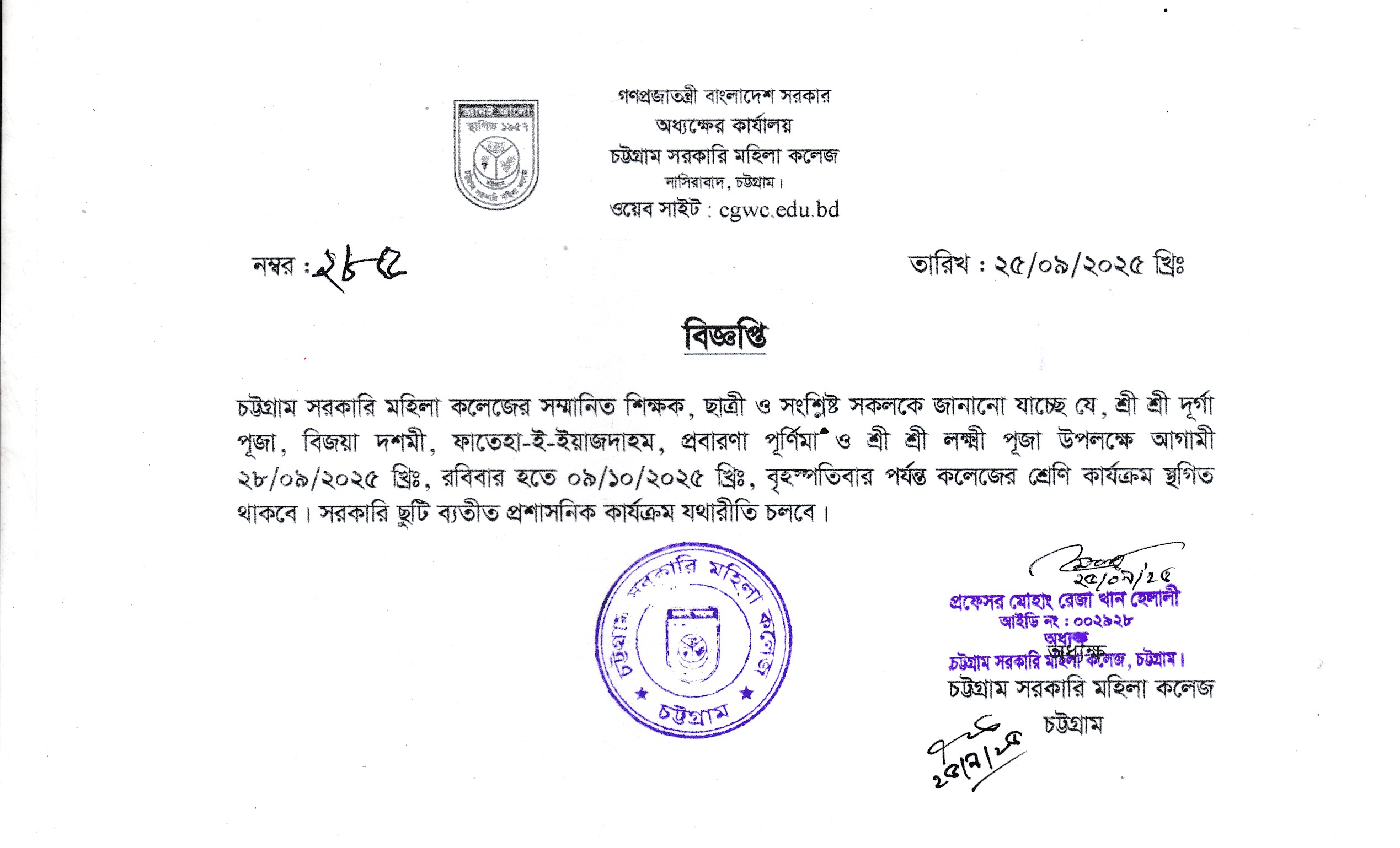 শ্রী শ্রী দূর্গা পূজা উপলক্ষে কলেজের শ্রেণি কার্যক্রম স্থগিত সংক্রান্ত বিজ্ঞপ্তি।