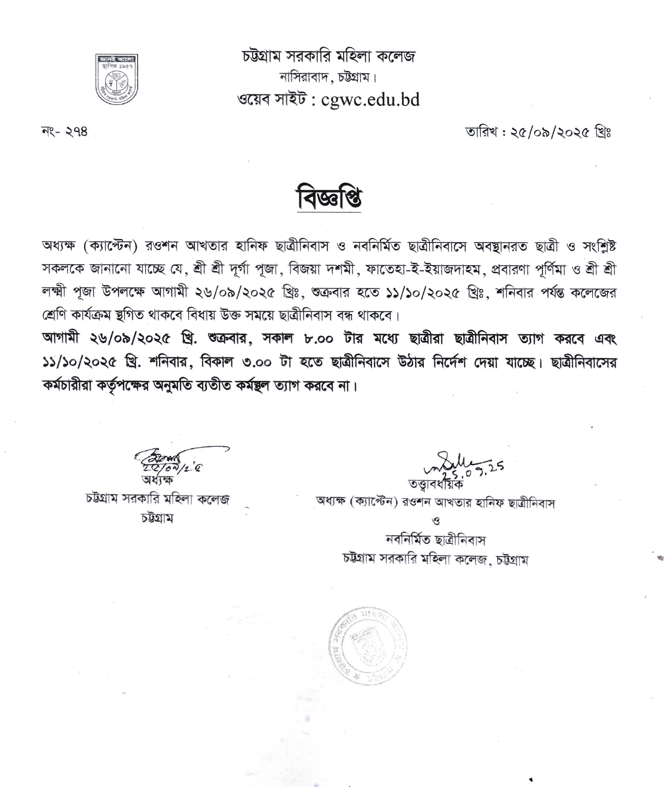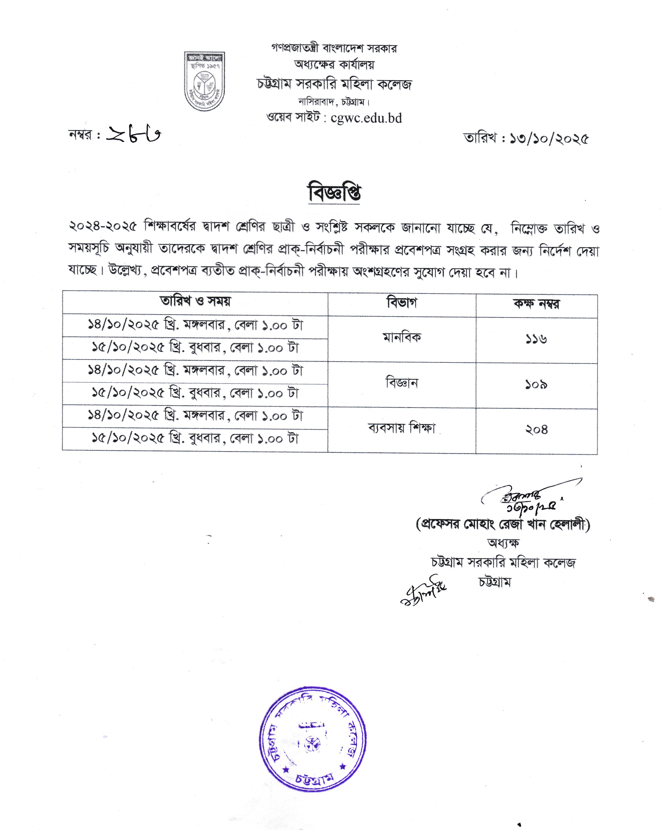 ২০২৫-২০২৬ শিক্ষাবর্ষে একাদশ শ্রেণির ছাত্রীদের ছাত্রীনিবাসের জন্য আবেদনকারী ছাত্রীদের সাক্ষাৎকার সংক্রান্ত বিজ্ঞপ্তি।