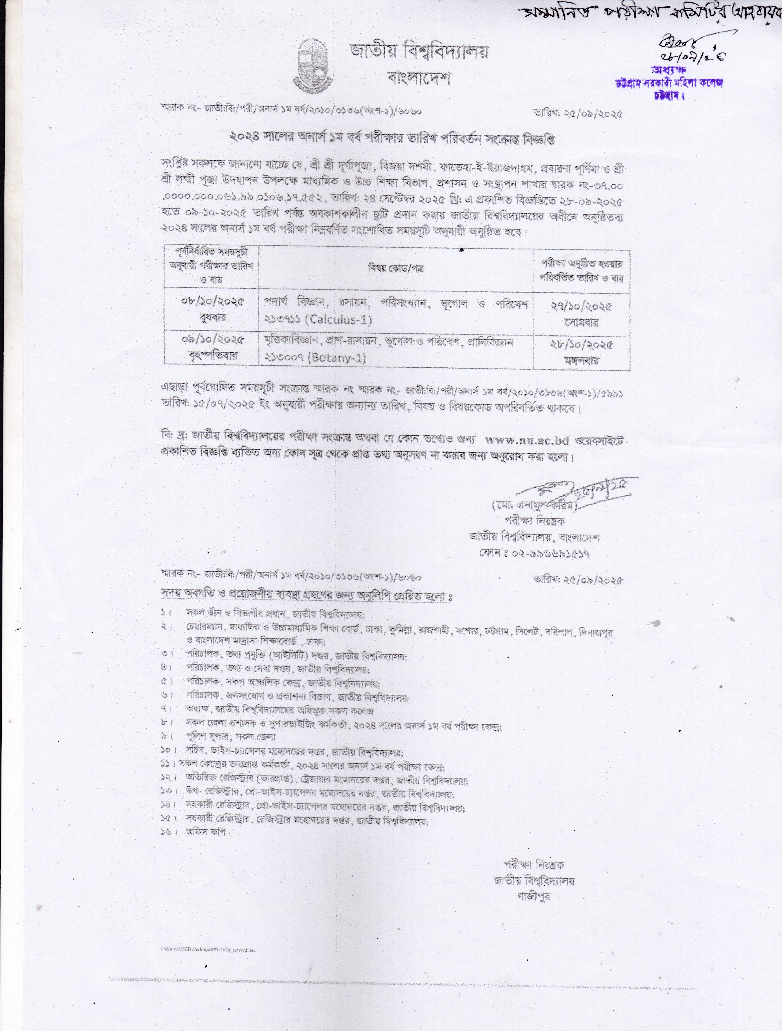 ২০২৪ সালের অনার্স ১ম বর্ষের পরীক্ষা তারিখ পরিবর্তন সংক্রান্ত বিজ্ঞপ্তি