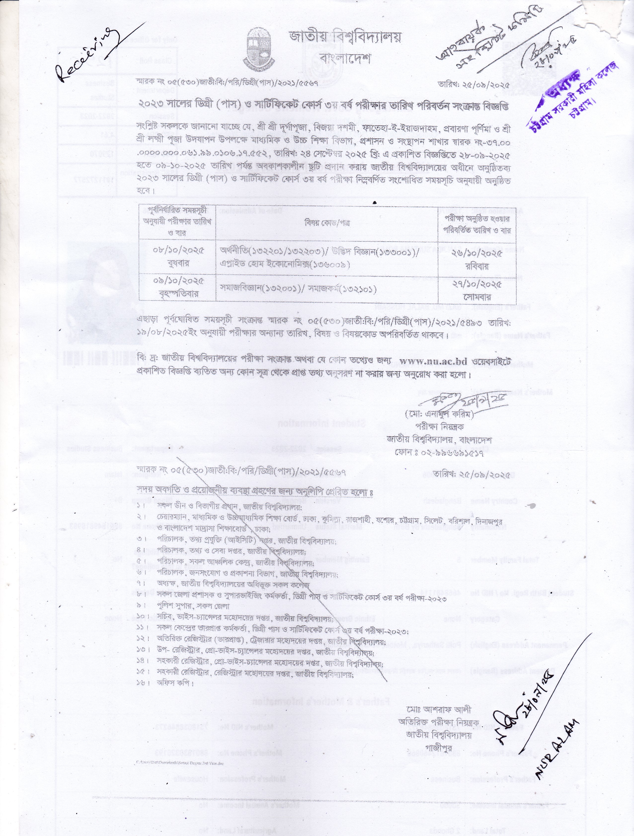 ২০২৩ সালের ডিগ্রি (পাস) ও সার্টিফিকেট কোর্স ৩য় বর্ষ পরীক্ষার তারিখ পরিবর্তন সংক্রান্ত বিজ্ঞপ্তি