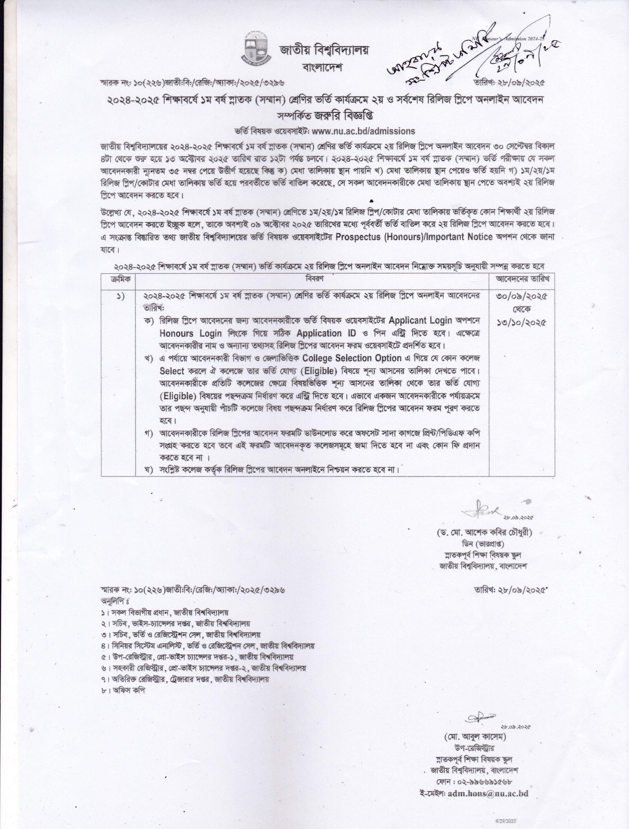 ২০২৪-২০২৫ শিক্ষাবর্ষে অনার্স ১ম বর্ষে ২য় রিলিজ স্লিপে আবেদন সংক্রান্ত বিজ্ঞপ্তি
