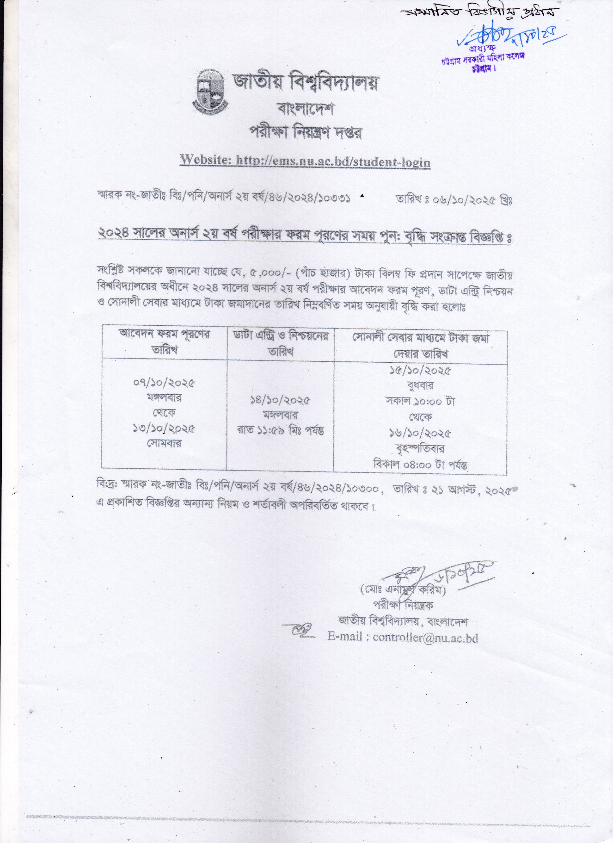 ২০২৪ সালের অনার্স ২য় বর্ষ পরীক্ষার ফরম পূরণে সময় পুণঃবৃদ্ধি সংক্রান্ত বিজ্ঞপ্তি।