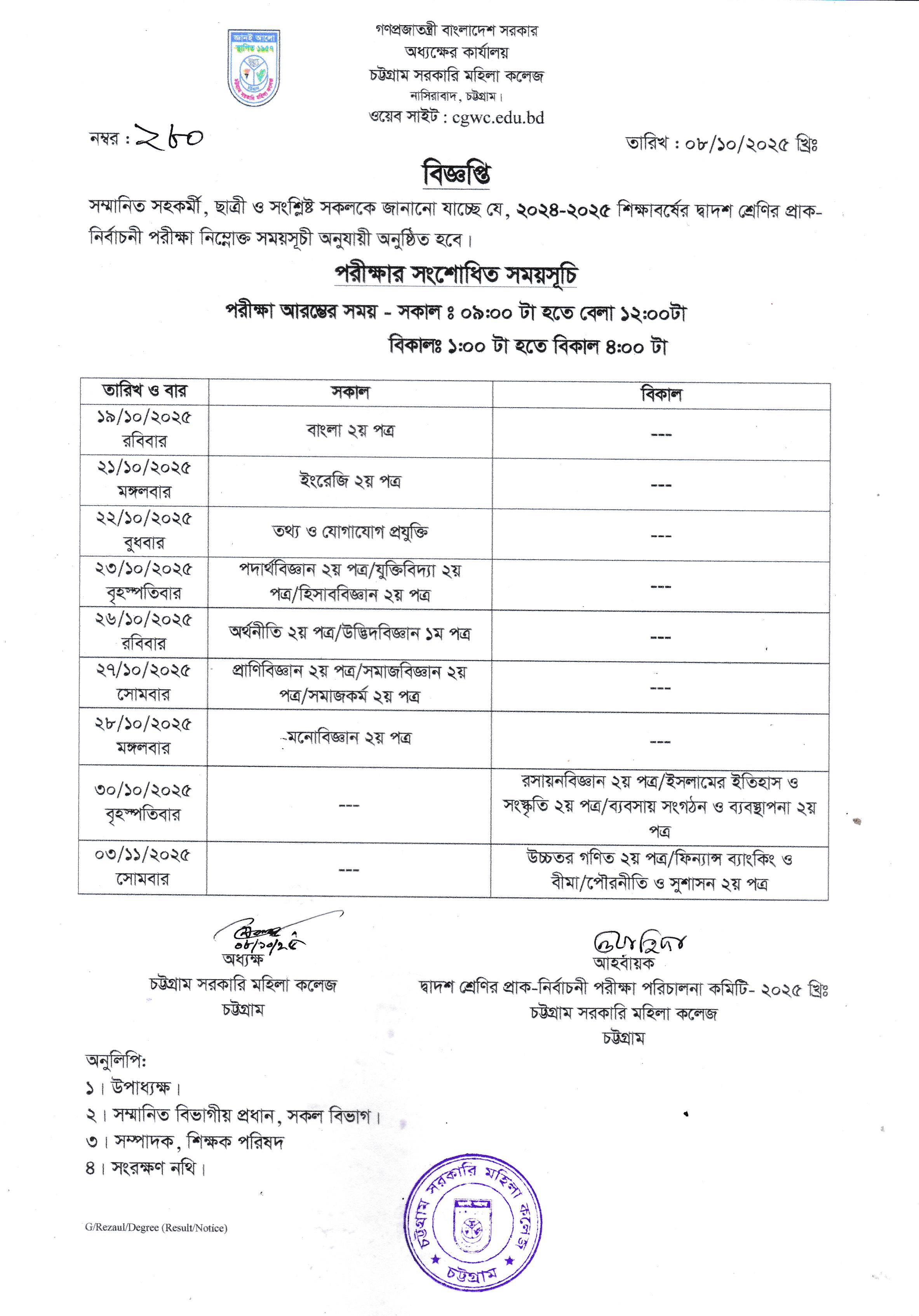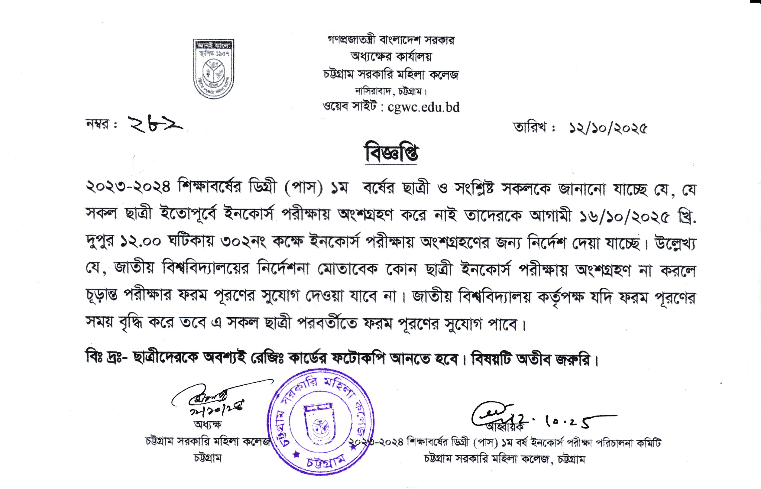 ২০২৩-২০২৪ শিক্ষাবর্ষের ডিগ্রী (পাস) ১ম বর্ষের ছাত্রীদের ইনকোর্স পরীক্ষার সময় বর্ধিতকরণ প্রসঙ্গে।