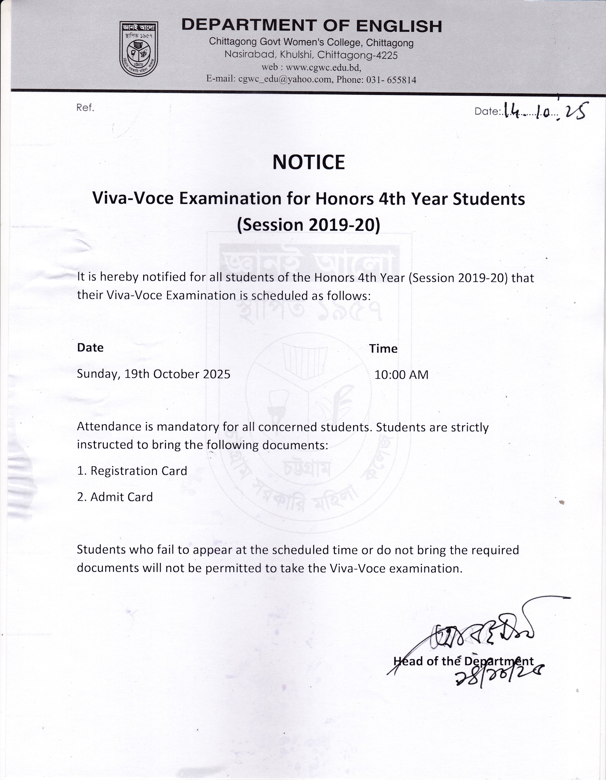 কলেজের ইংরেজি বিভাগের ২০২৩ সালের অনার্স ৪র্থ বর্ষ পরীক্ষার্থীদের মৌখিক পরীক্ষার সময়সূচি প্রকাশ