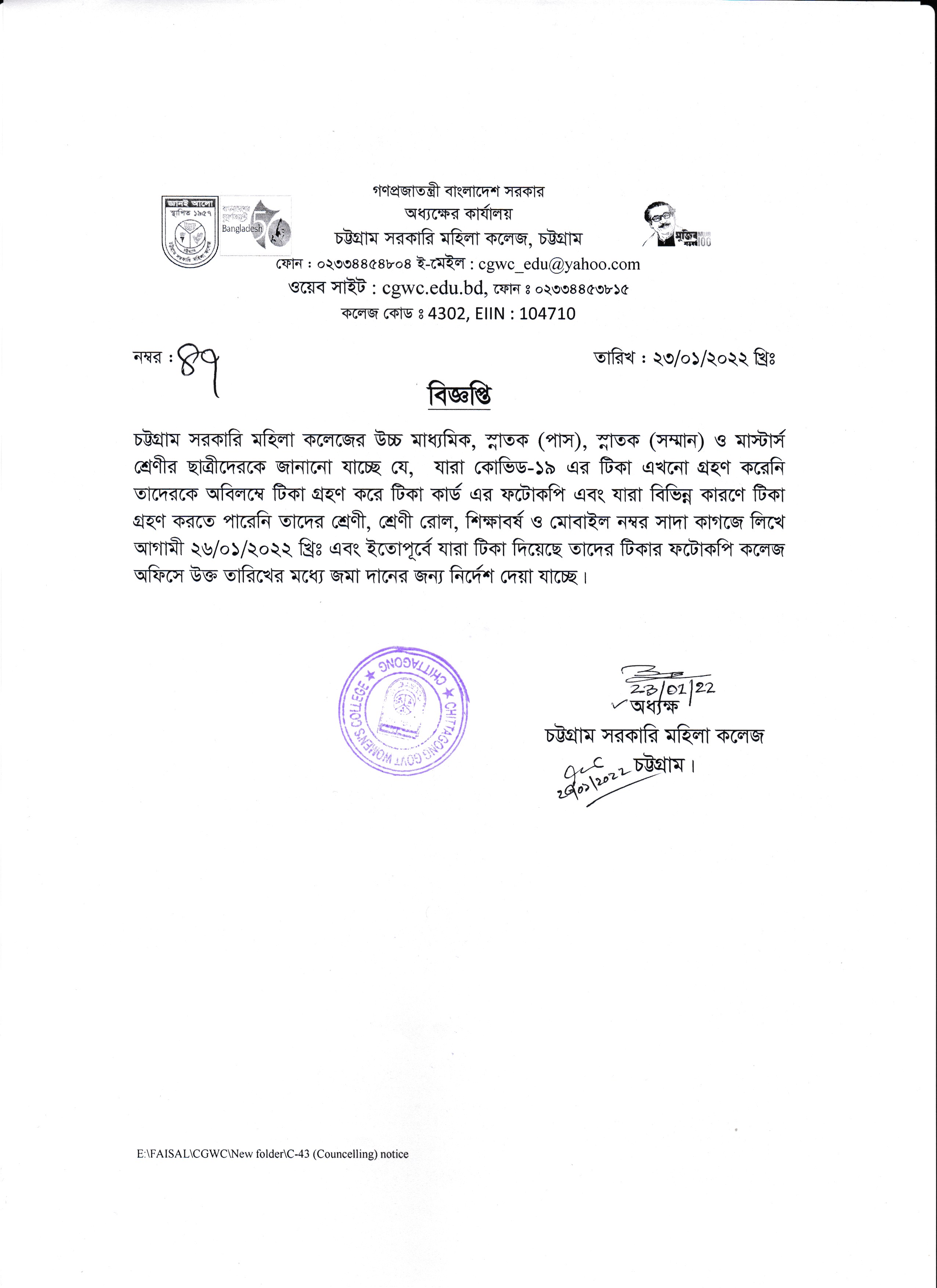 কলেজের সকল শ্রেণির ছাত্রীদের কোভিড-১৯ এর টিকা গ্রহণ করা ও টিকা কার্ডের ফটোকপি জমা দেয়ার বিজ্ঞপ্তি (২৩/০১/২০২২)