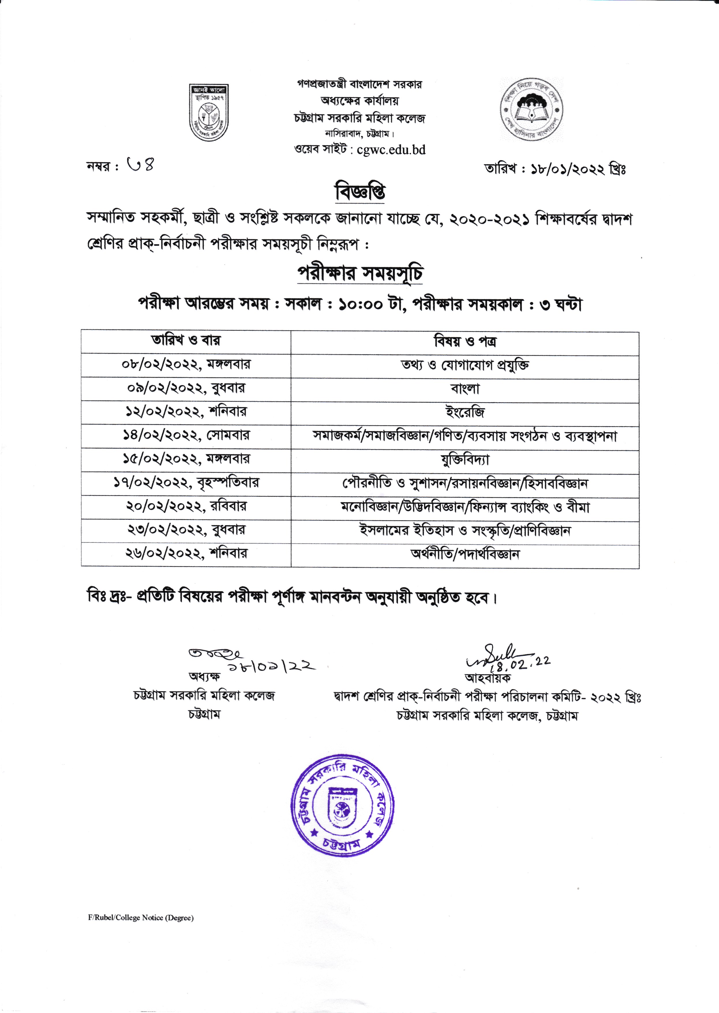 ২০২০-২০২১ শিক্ষাবর্ষে দ্বাদশ শ্রেণির প্রাক্-নির্বাচনী পরীক্ষার সময়সূচী প্রকাশ (১৮/০১/২০২২)