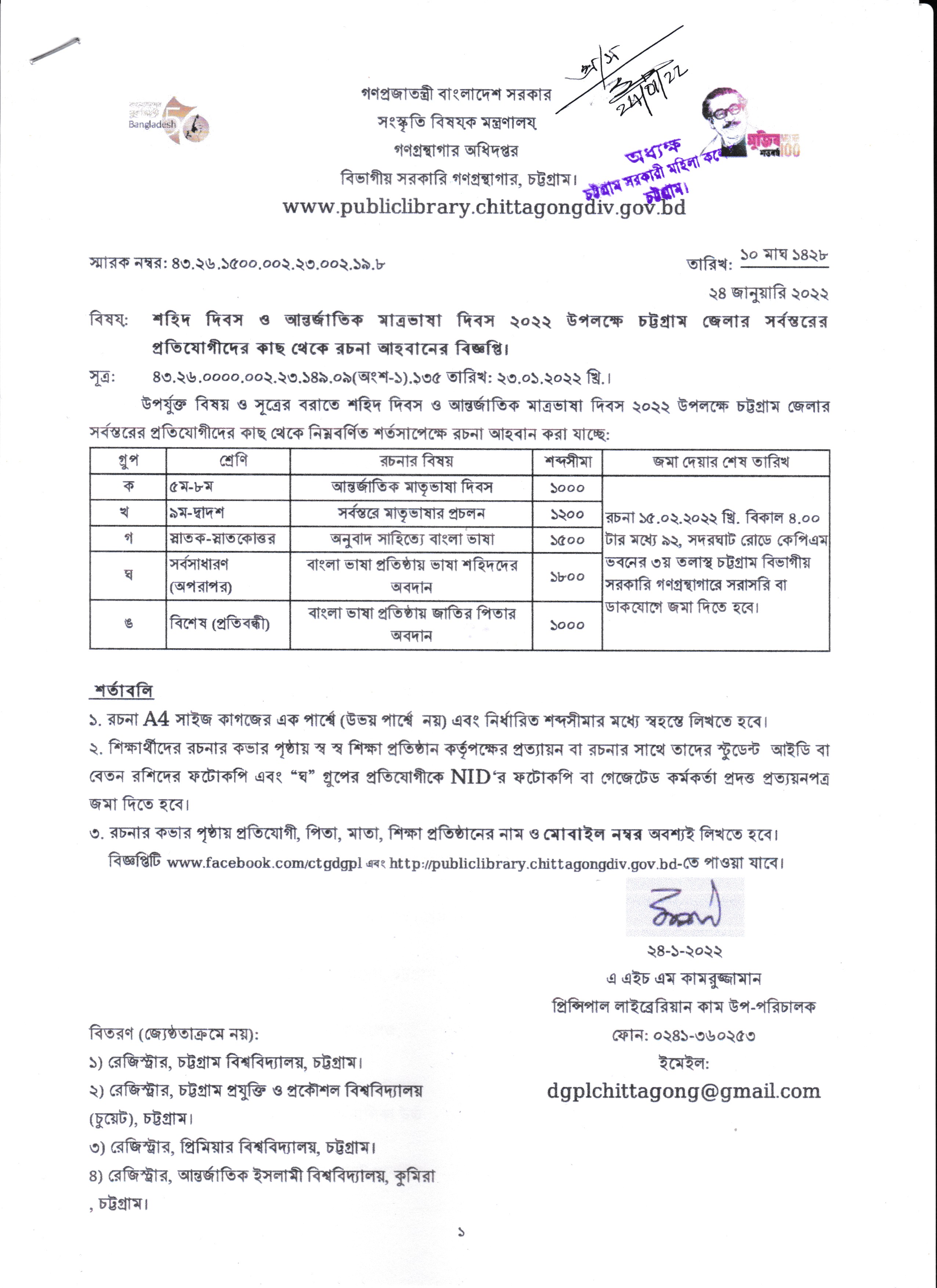 শহিদ দিবস ও আন্তর্জাতিক মাতৃভাষা দিবস-২০২২ উপলক্ষে রচনা প্রতিযোগীতার বিজ্ঞপ্তি (২৪/০১/২০২২)