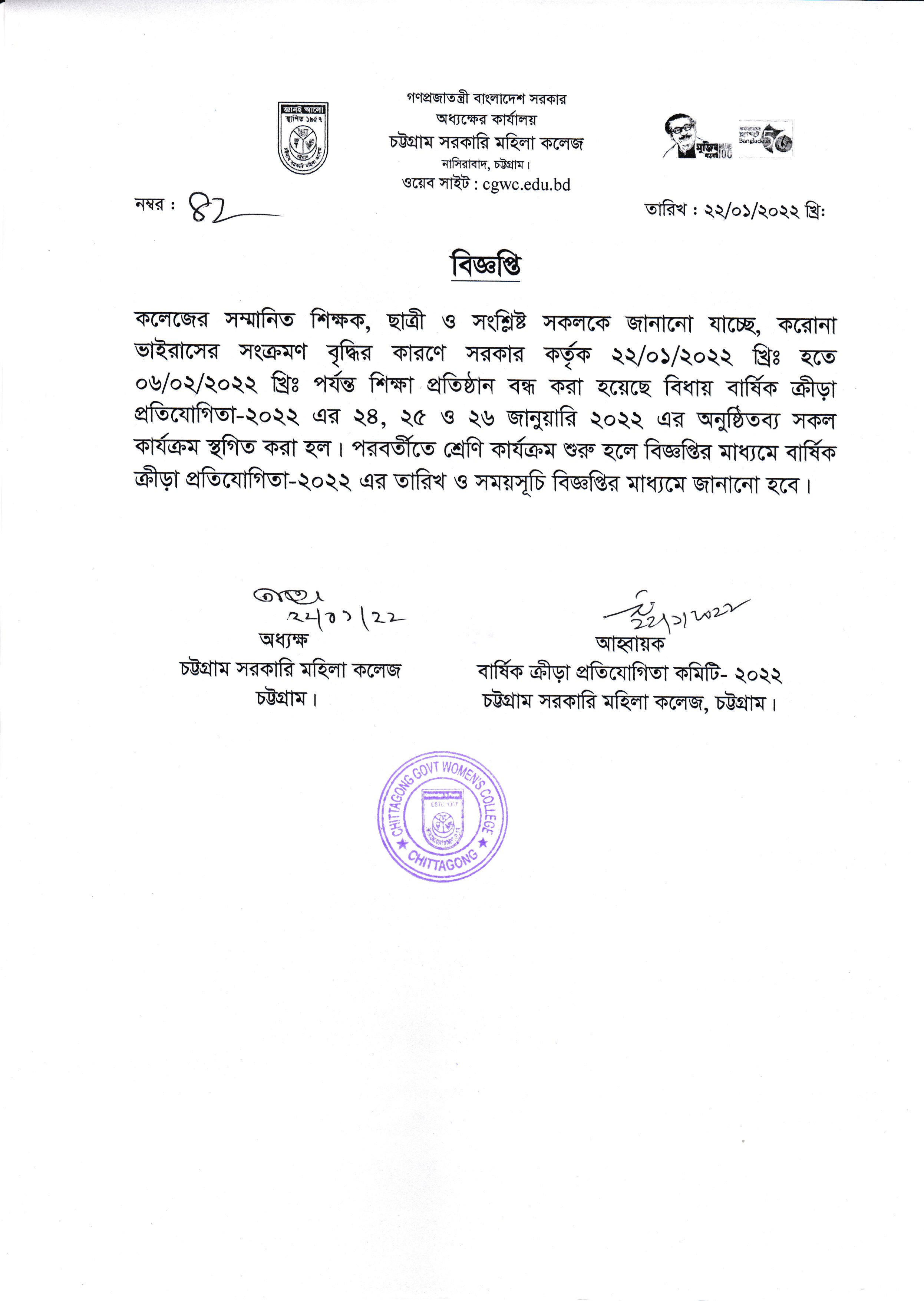 বার্ষিক বহি:ক্রীড়া প্রতিযোগিতা-২০২২ এর স্থগিত সংক্রান্ত বিজ্ঞপ্তি (২২/০১/২০২২)