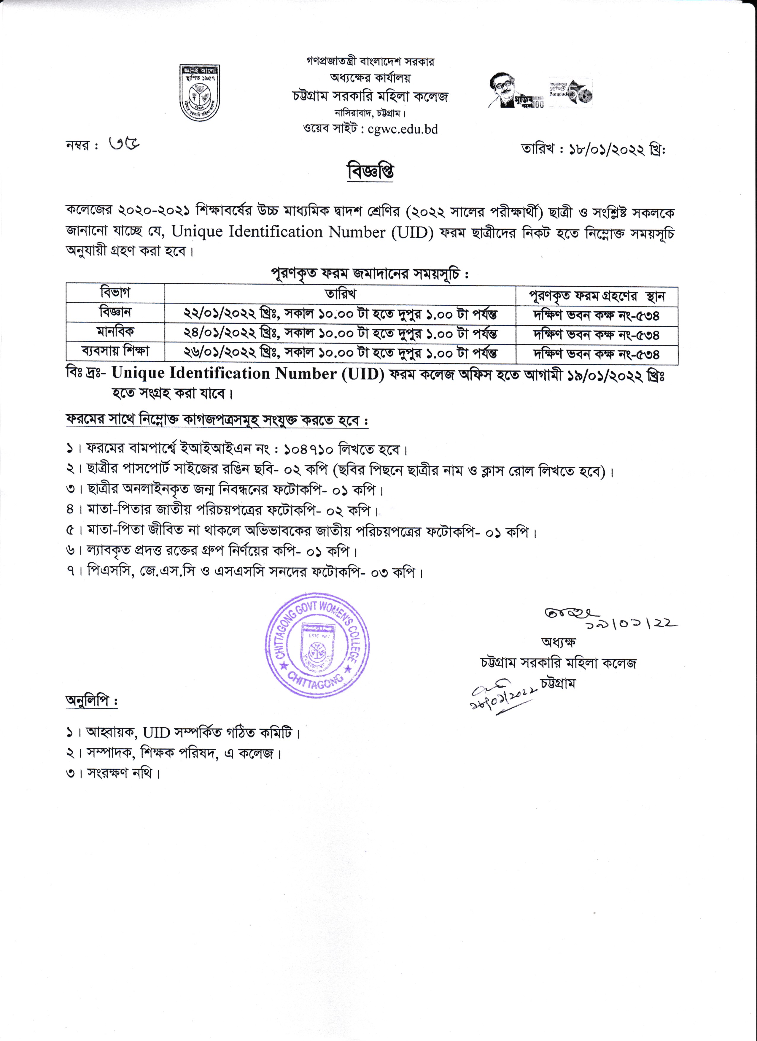 ২০২০-২০২১ শিক্ষাবর্ষে উচ্চ মাধ্যমিক দ্বাদশ শ্রেণির (২০২২ সালের এইচএসসি পরীক্ষার্থী) ছাত্রীদের ইউনিক আইডি ফরম সংগ্রহ ও জমাদান সংক্রান্ত বিজ্ঞপ্তি (১৯/০১/২০২২)