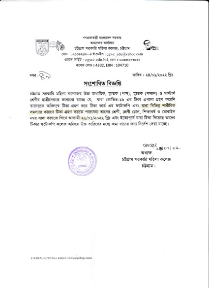 কলেজের সকল শ্রেণির ছাত্রীদের কোভিড-১৯ এর টিকা গ্রহণ করা ও টিকা কার্ডের ফটোকপি জমা দেয়ার সংশোধত বিজ্ঞপ্তি (২৪/০১/২০২২)