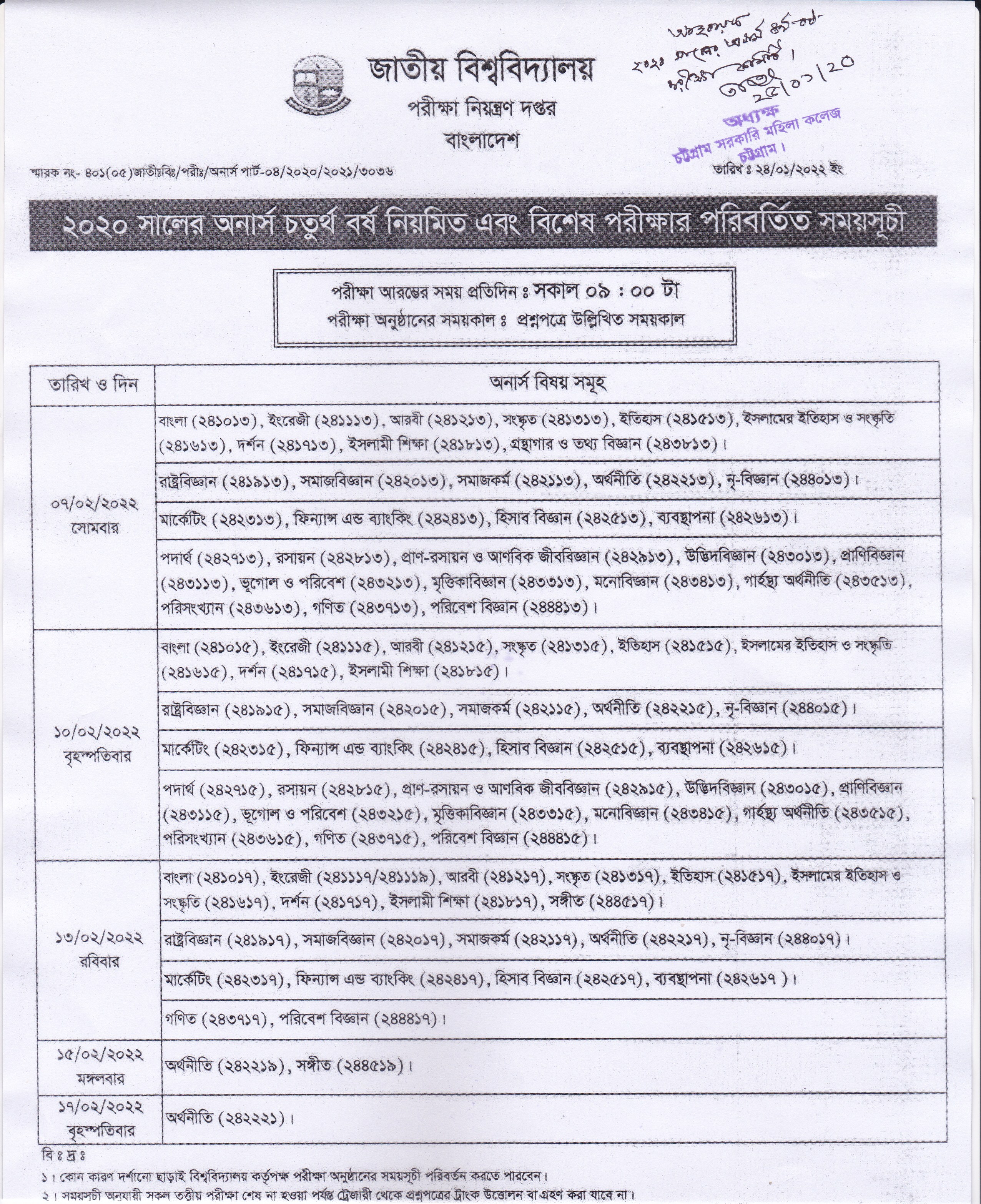 ২০২০ সালের অনার্স ৪র্থ বর্ষ চূড়ান্ত পরীক্ষার সংশোধিত সময় সূচী প্রকাশ (২৫/০১/২০২২)