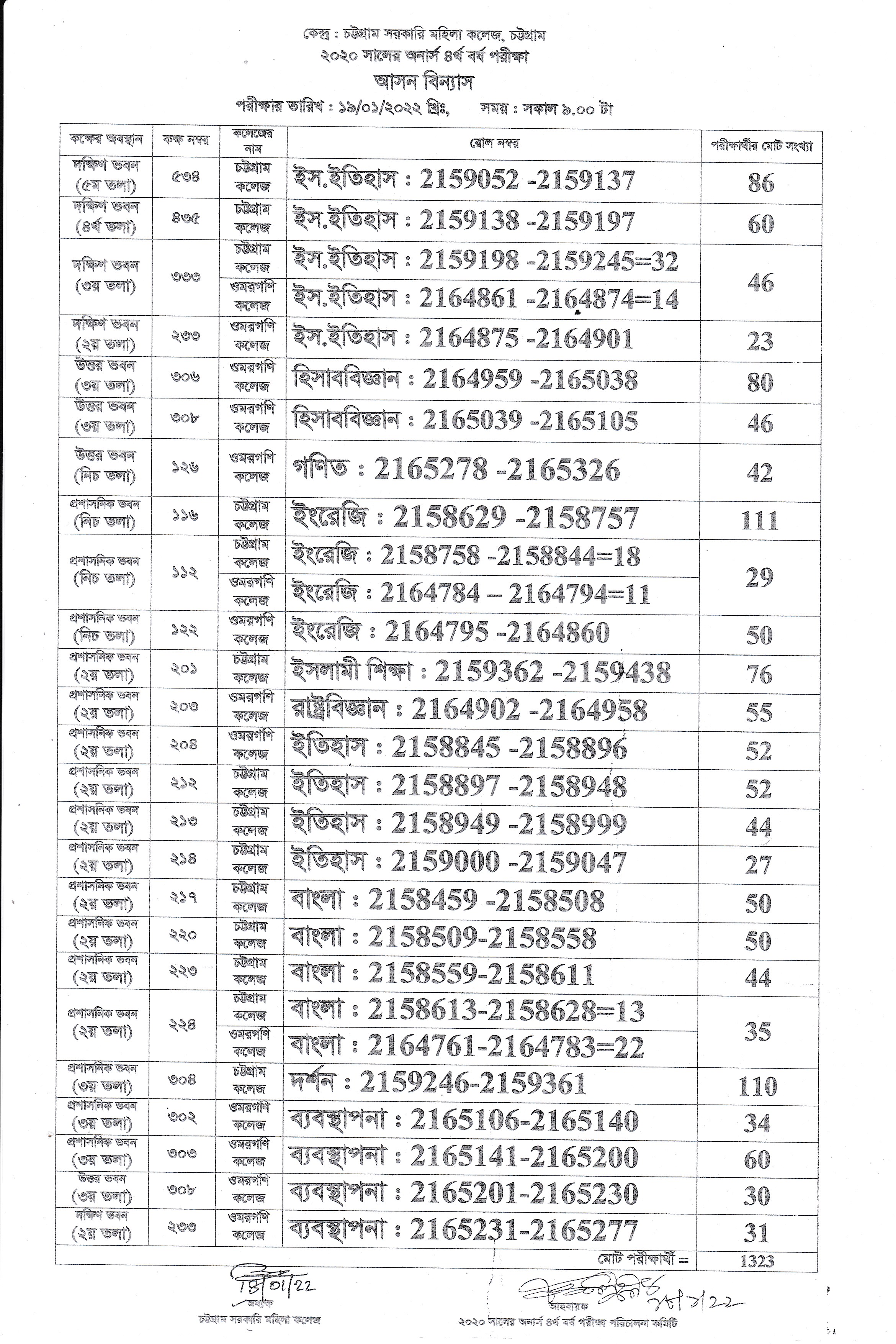 ২০২০ সালের অনার্স ৪র্থ বর্ষ পরীক্ষার আসন বিন্যাস (তারিখ : ১৯.০১.২০২২ খ্রিঃ)