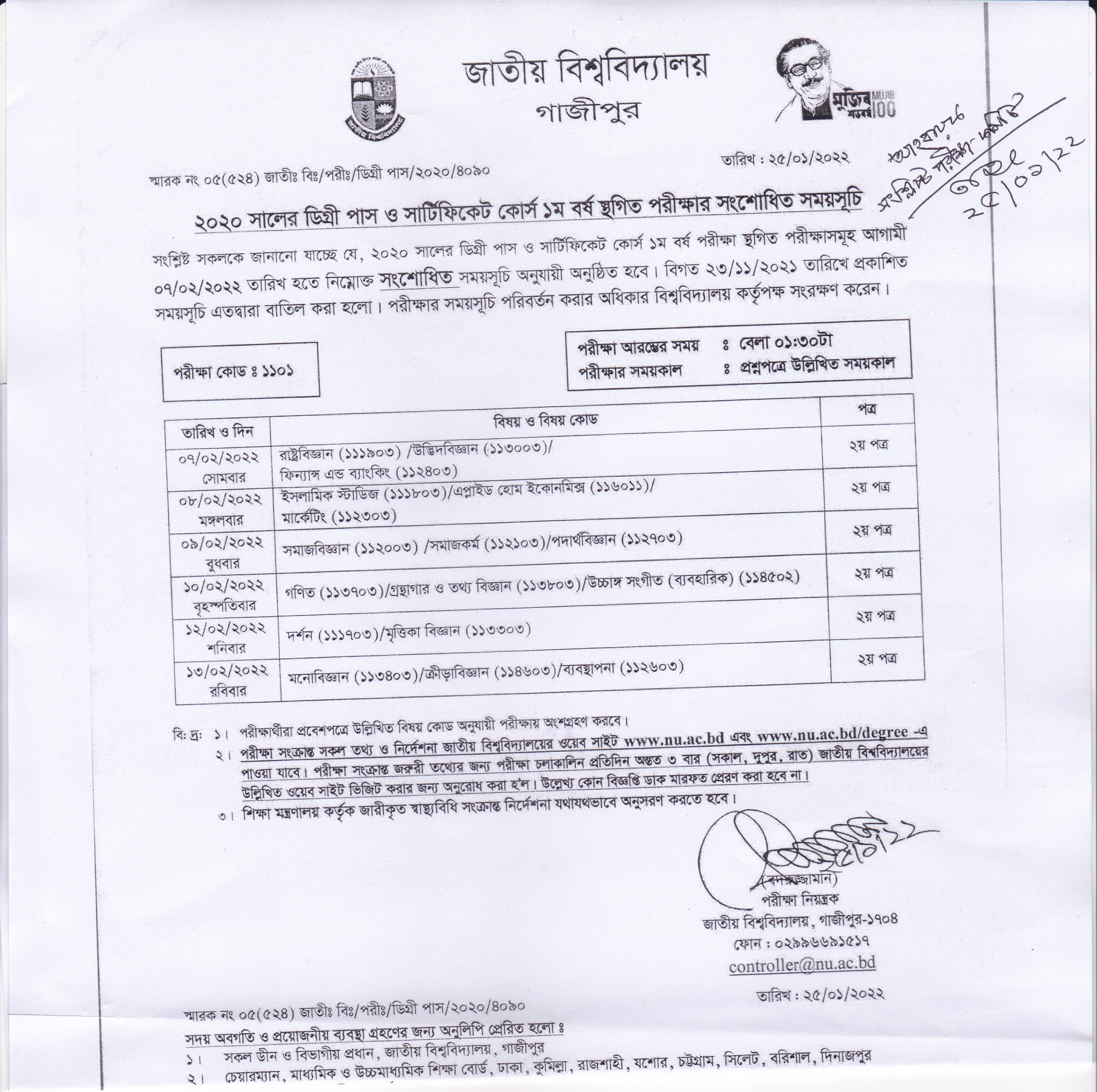২০২০ সালের ডিগ্রী (পাস) ১ম বর্ষ চূড়ান্ত পরীক্ষার পরিবর্তিত সময়সূচী প্রকাশ (২৫/০১/২০২২)