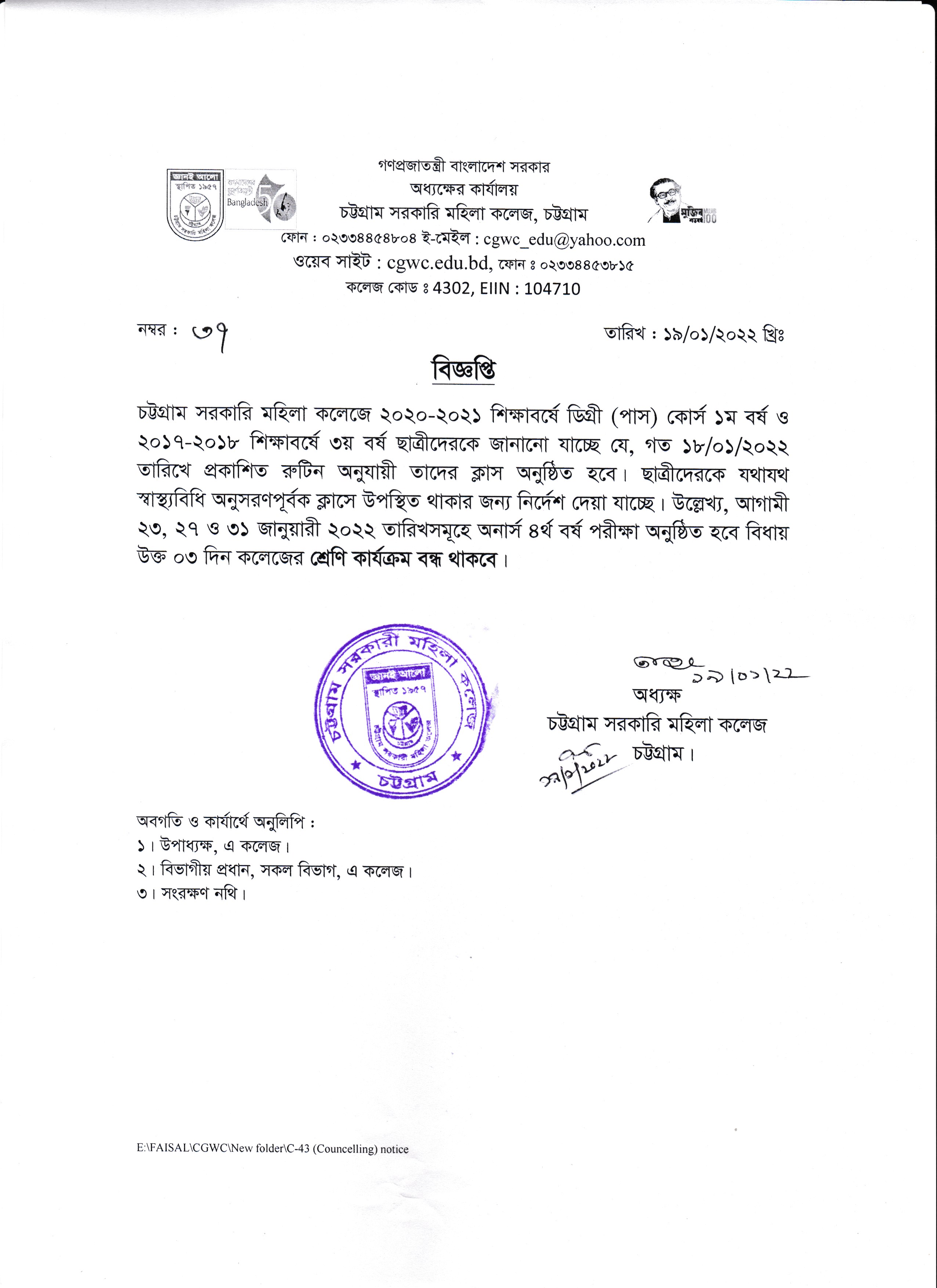 ডিগ্রী (পাস) ১ম ও ৩য় বর্ষের ক্লাস এর বিজ্ঞপ্তি প্রকাশ (১৯/০১/২০২২)