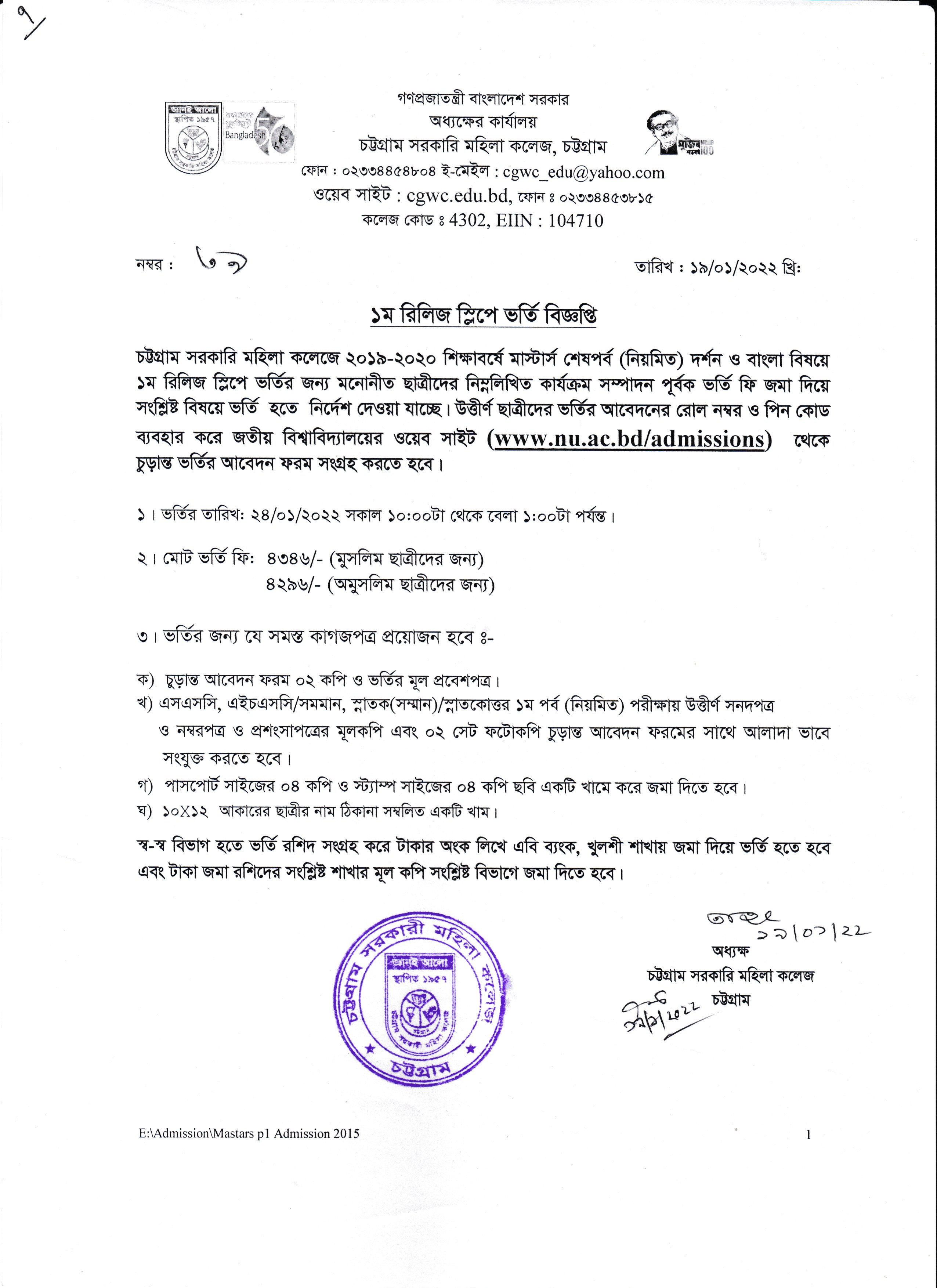 ২০১৯-২০২০ শিক্ষাবর্ষে মাস্টার্স শেষপর্ব ১ম রিলিজ স্লিপে ভর্তি বিজ্ঞপ্তি (২৩/০১/২০২২)