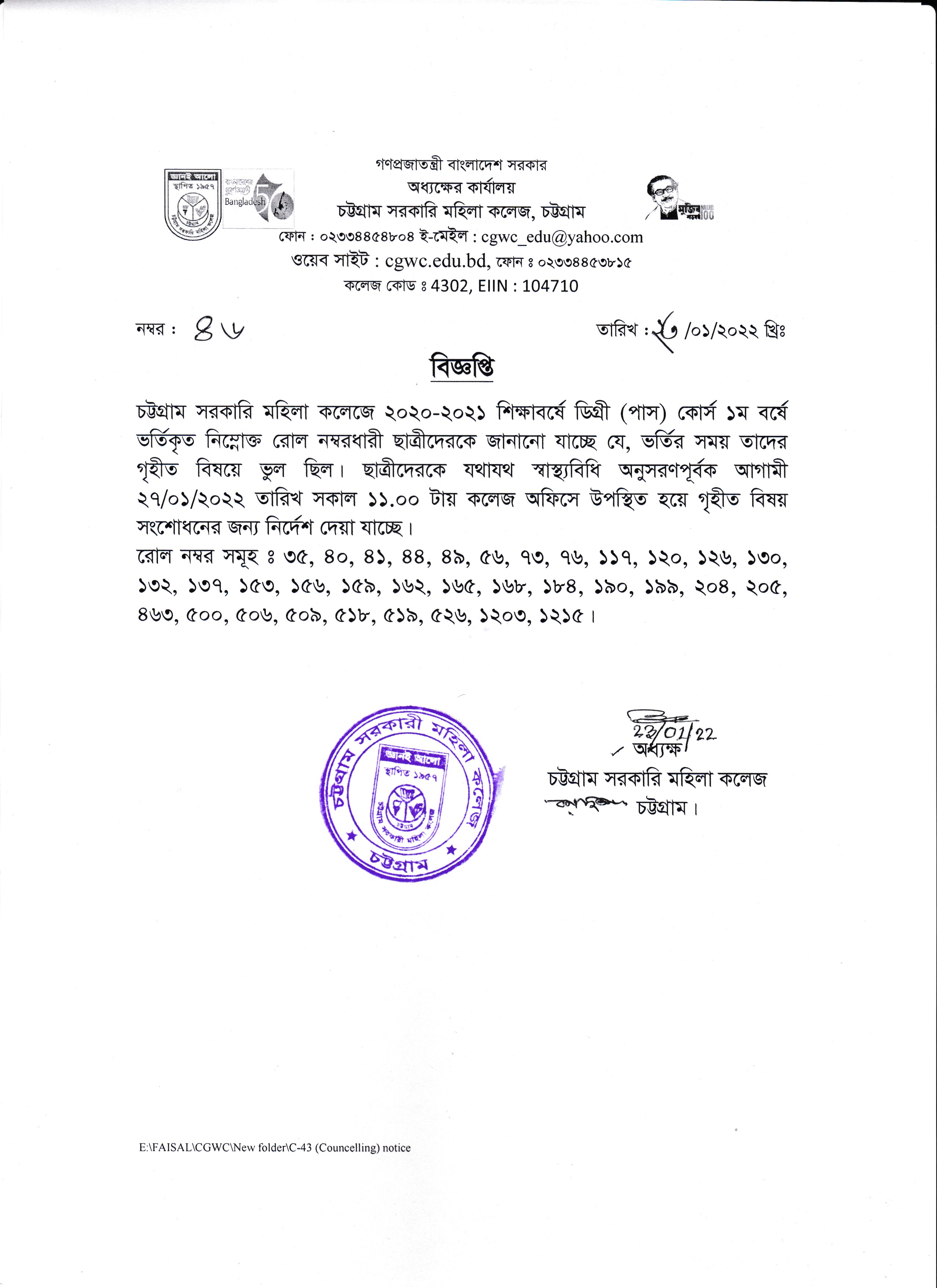 ২০২০-২০২১ শিক্ষাবর্ষে ডিগ্রী (পাস) ১ম বর্ষে ভর্তিকৃত ছাত্রীদের বিষয় সংশোধনের বিজ্ঞপ্তি (২৩/০১/২০২২)