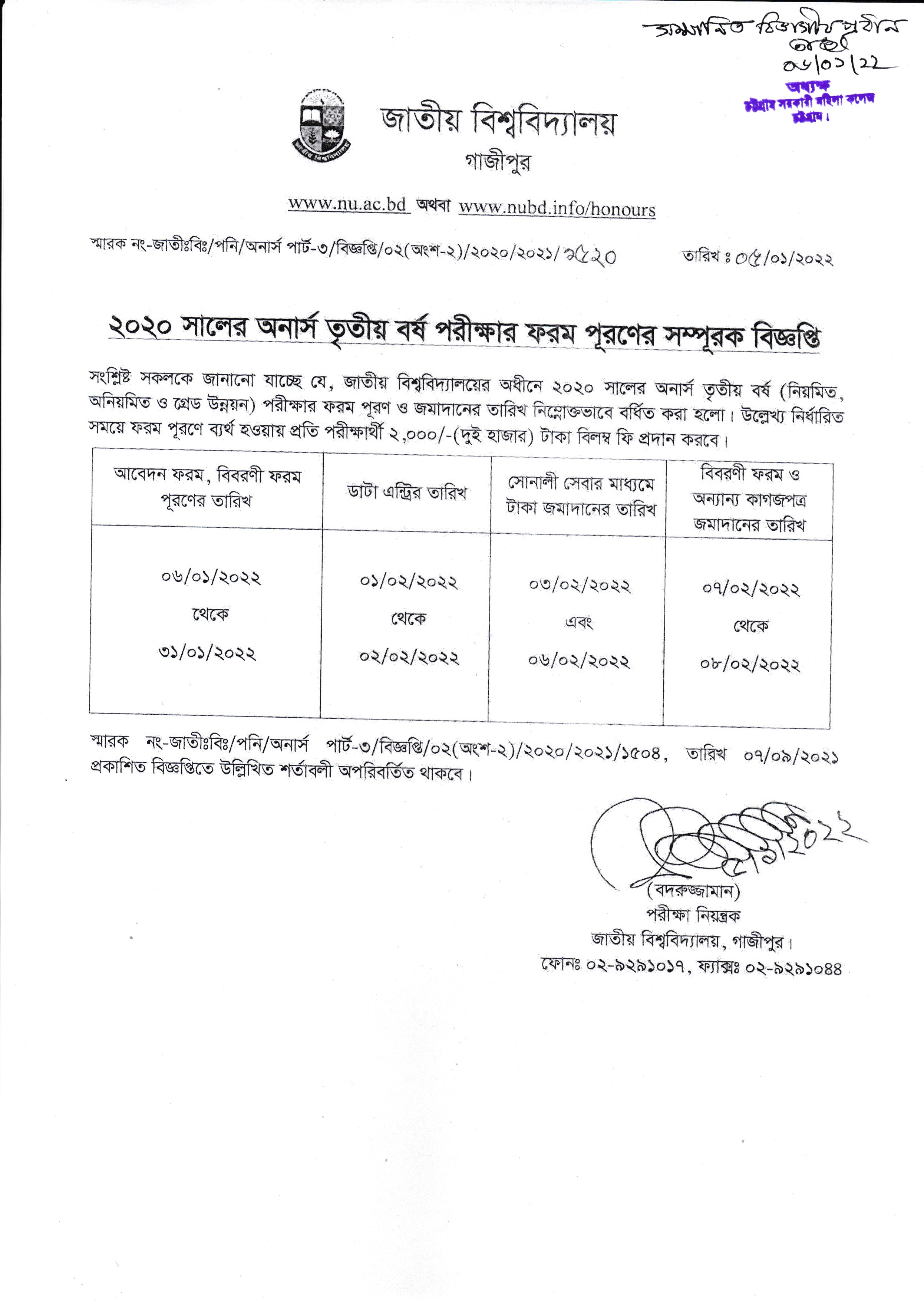 ২০২০ সালের অনার্স ৩য় বর্ষ ফরম পূরনের সম্পূরক বিজ্ঞপ্তি (০৬/০১/২০২২)