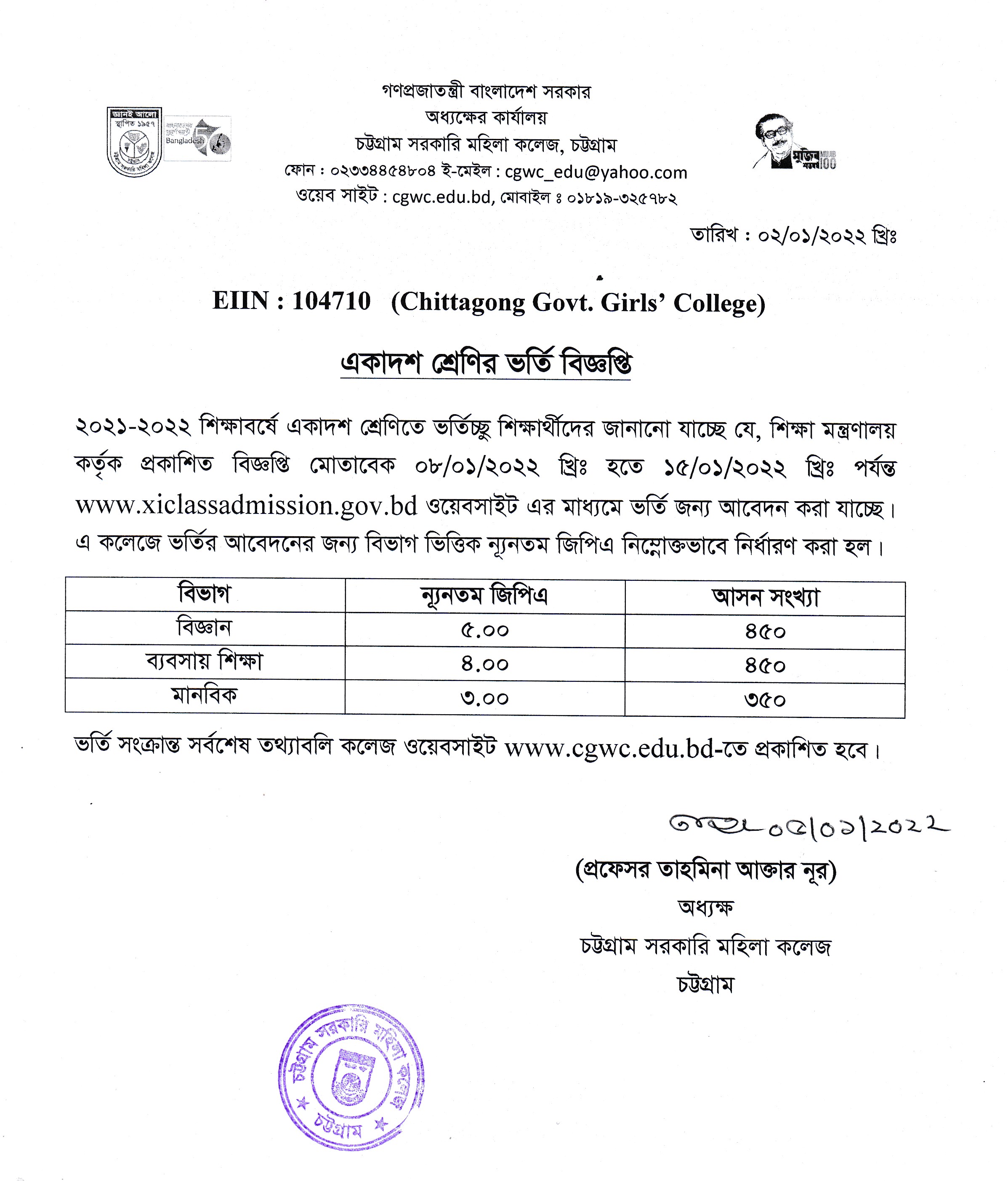 ২০২১-২০২২ শিক্ষাবর্ষে একাদশ শ্রেণিতে ভর্তি সংক্রান্ত বিজ্ঞপ্তি প্রকাশ (০৫.০১.২০২২ খ্রিঃ)