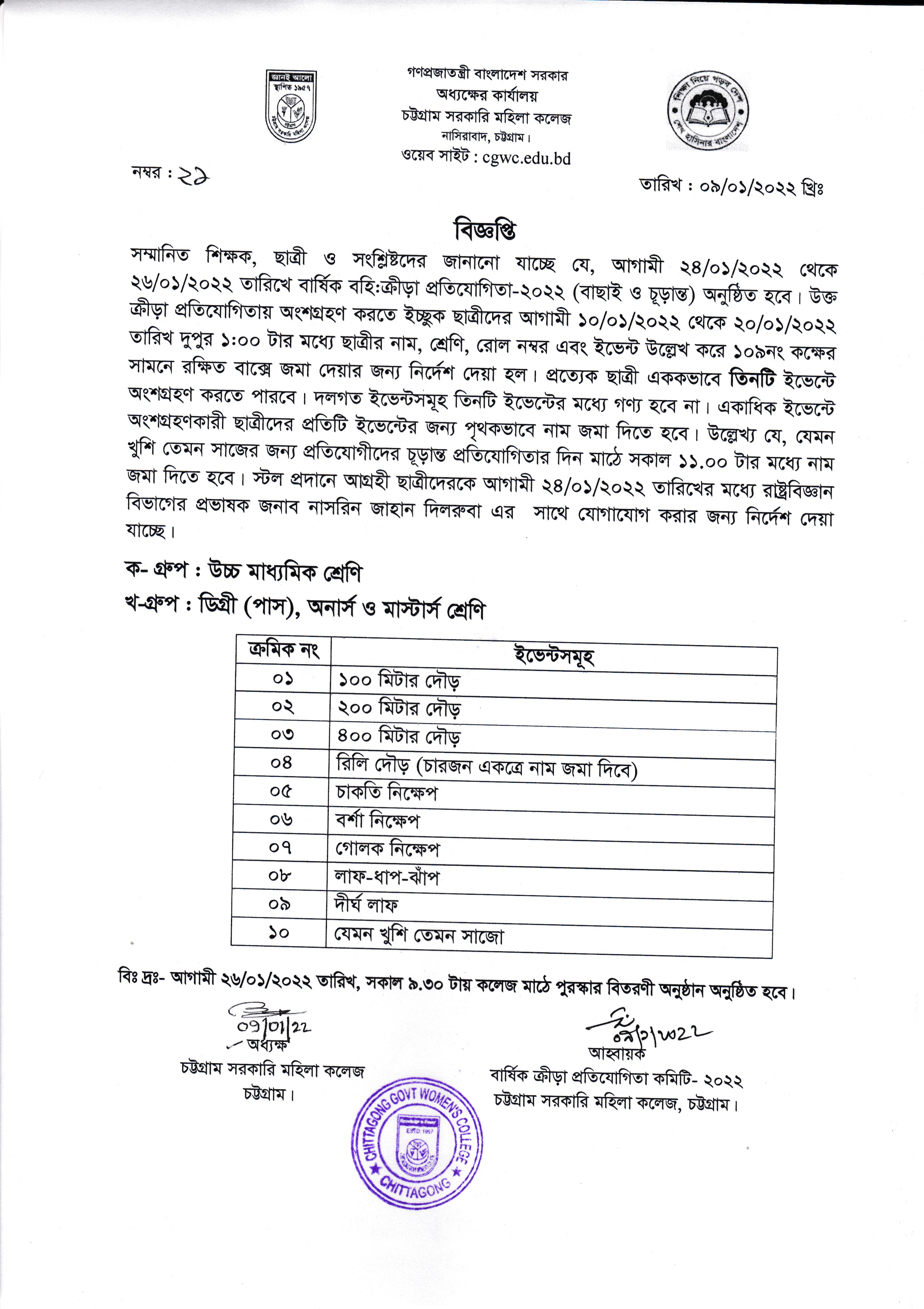 বার্ষিক বহি:ক্রীড়া প্রতিযোগিতা-২০২২ এর বিজ্ঞপ্তি প্রকাশ (০৯/০১/২০২২)