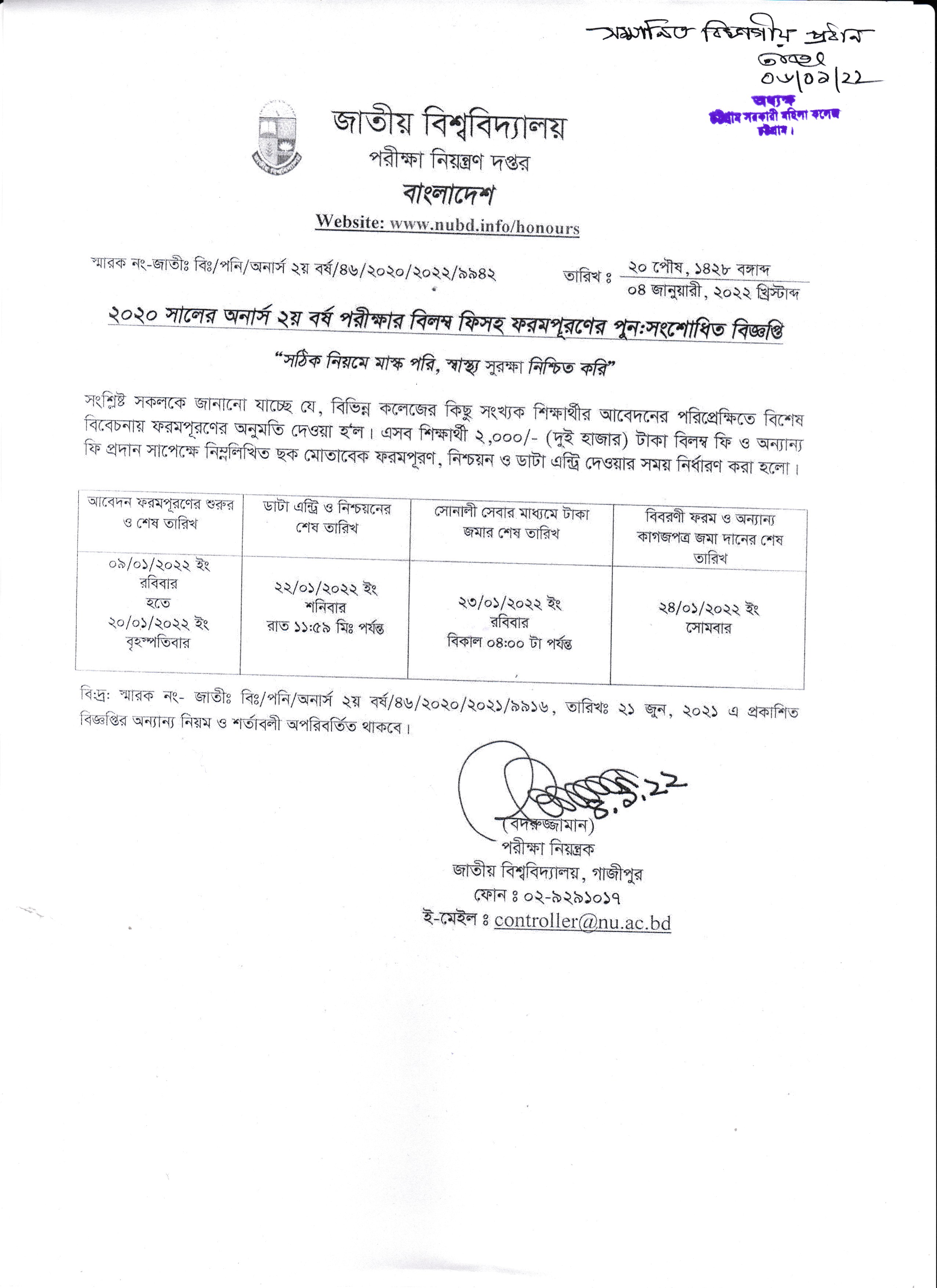 ২০২০ সালের অনার্স ২য় বর্ষ ফরম পূরনের সম্পূরক বিজ্ঞপ্তি (০৬/০১/২০২২)
