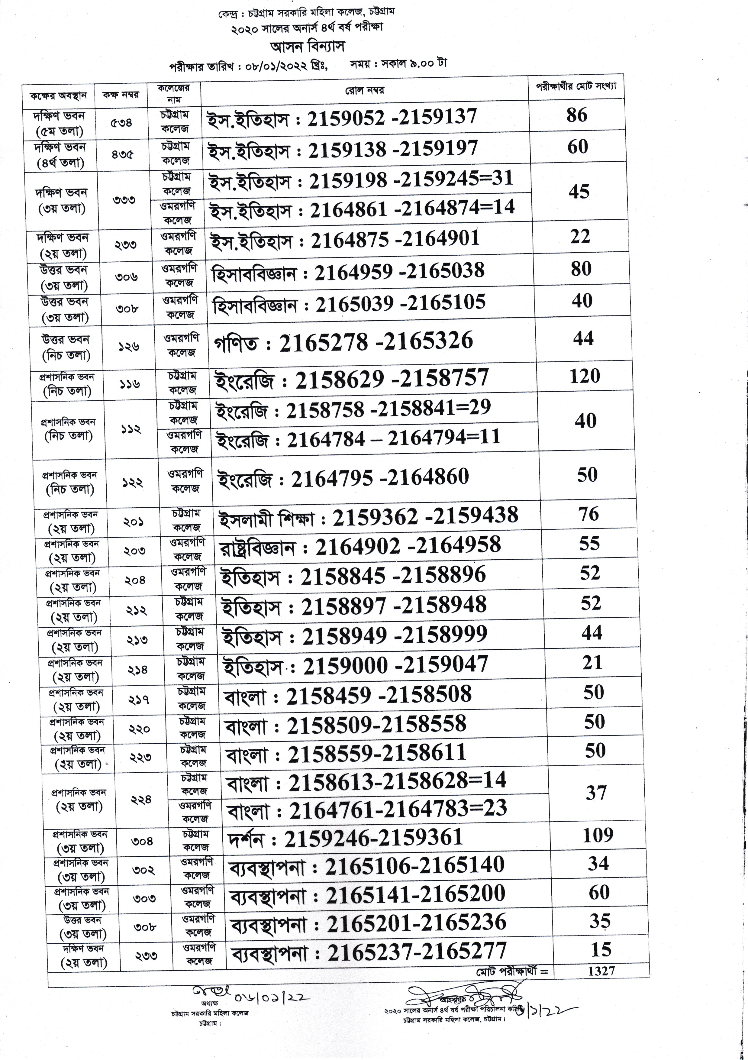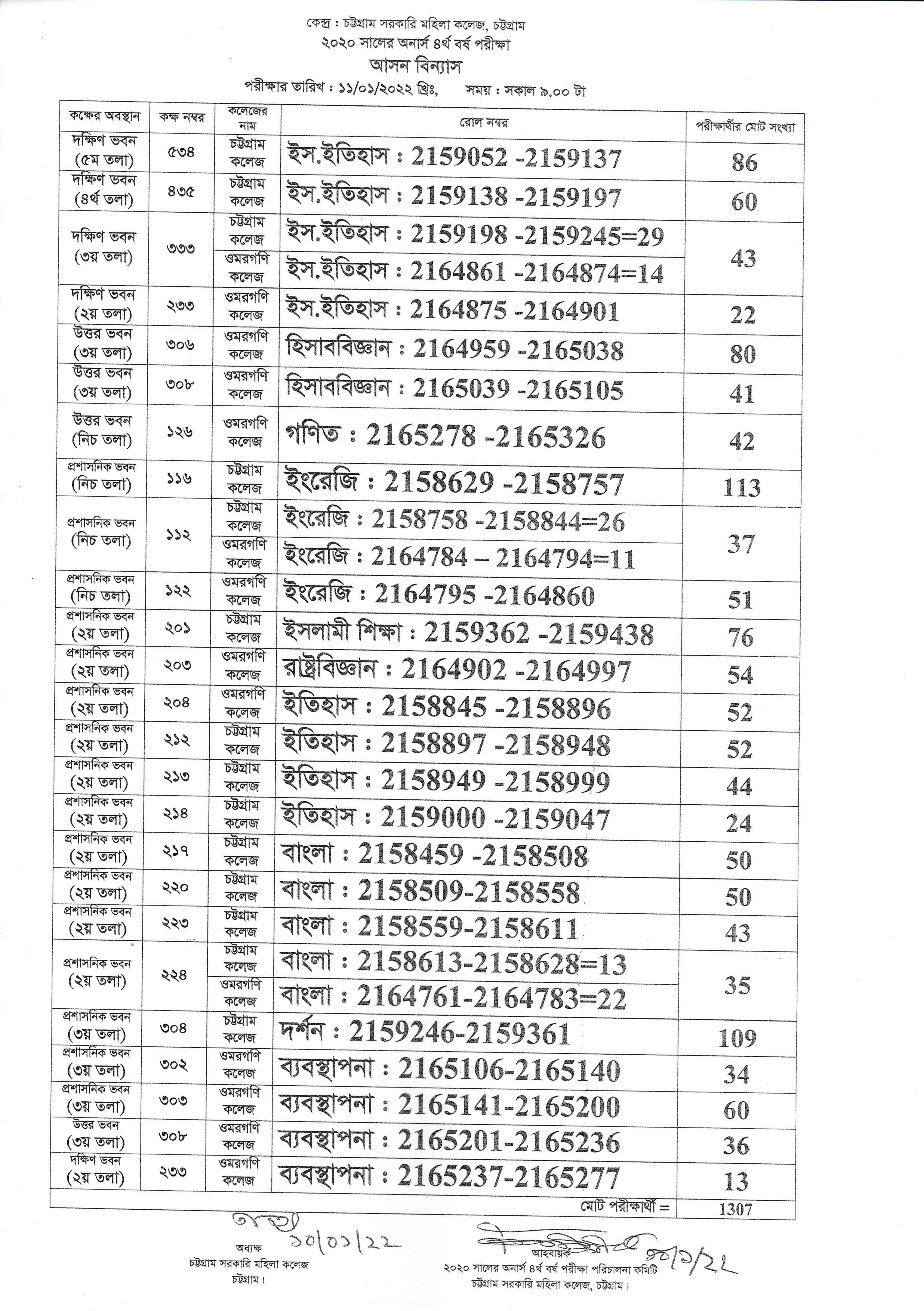 ২০২০ সালের অনার্স ৪র্থ বর্ষ চূড়ান্ত পরীক্ষা ১১/০১/২০২২ তারিখের আসন বিন্যাস প্রকাশ (১০/০১/২০২২)