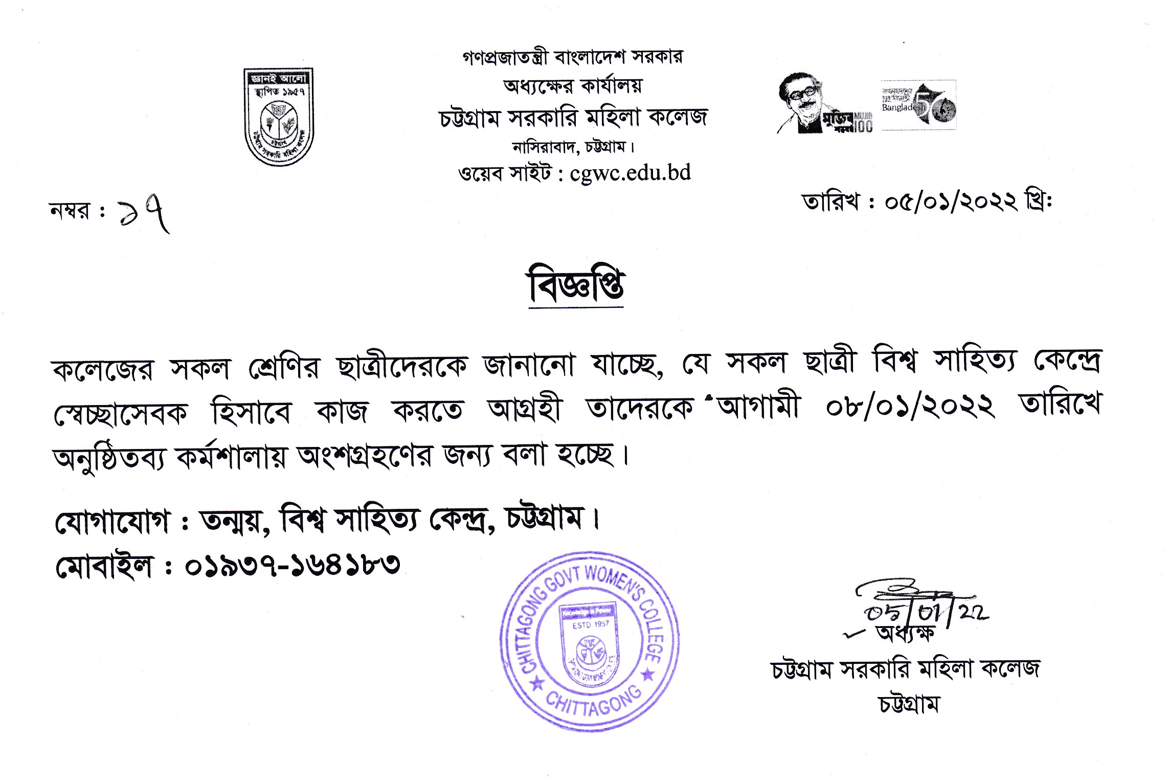 বিশ্ব সাহিত্য কেন্দ্রে স্বেচ্ছাসেবক হিসাবে কাজ করতে আগ্রহী ছাত্রীদের যোগযোগ করা প্রসঙ্গে।