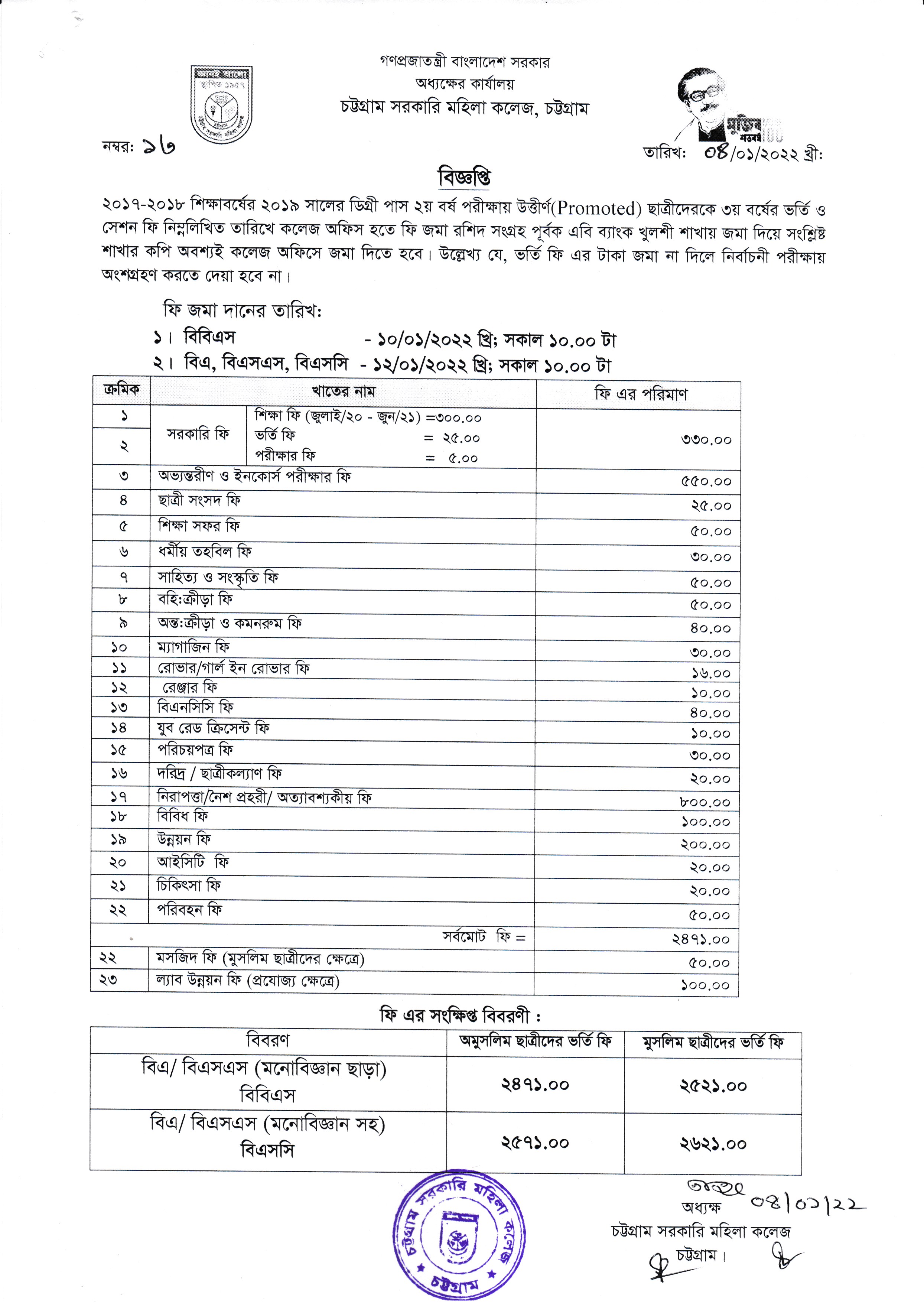 ২০১৭-২০১৮ শিক্ষাবর্ষে র ২০১৯ সালের ডিগ্রি (পাস) ২য় বর্ষ পরীক্ষায় উত্তীর্ণ ছাত্রীদের ৩য় বর্ষের ভর্তি ও সেশন ফি জমা দেয়ার বিজ্ঞপ্তি (০৪/০১/২০২২)