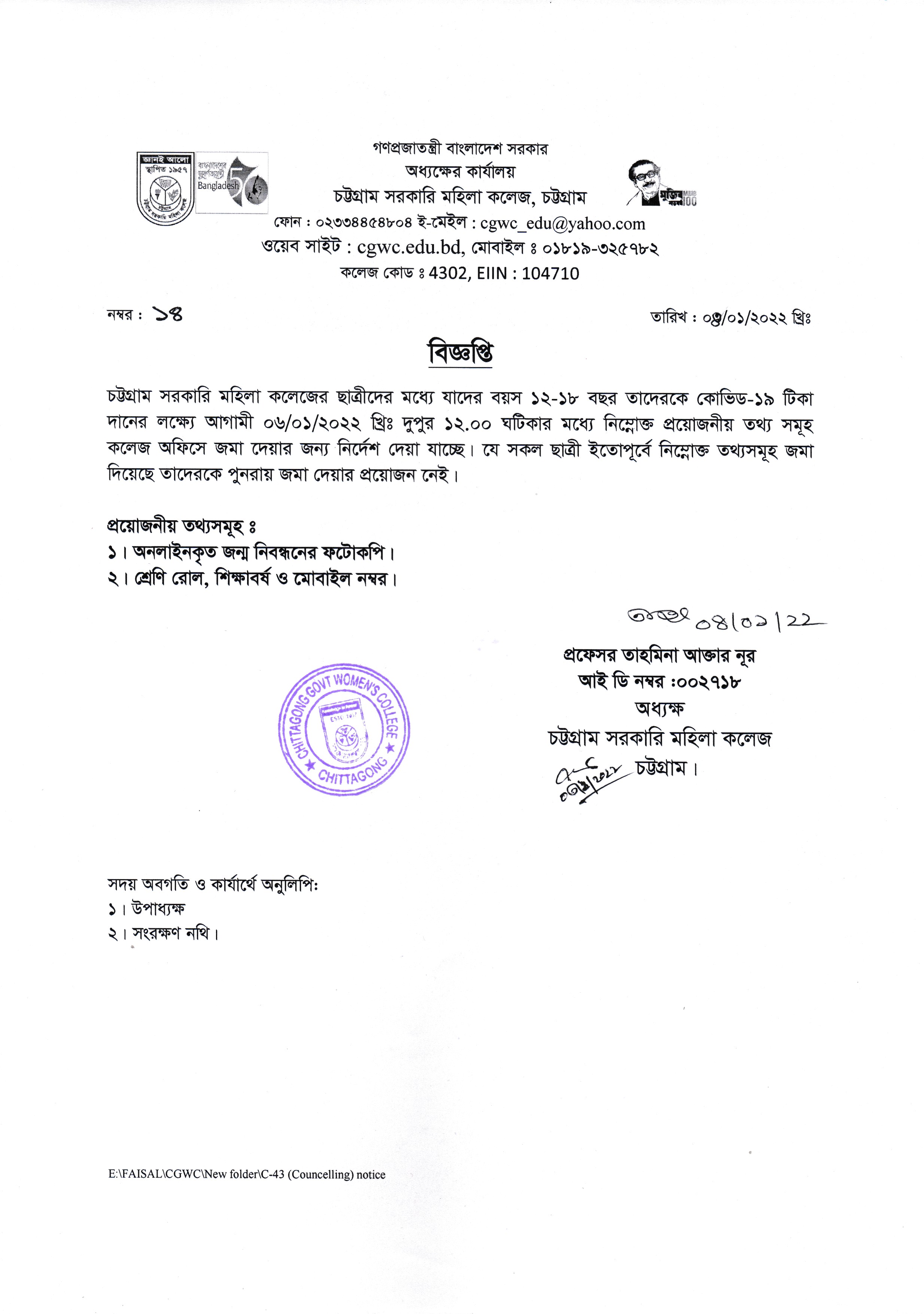 কলেজের ২০২২ সালের এইচ এস সি পরীক্ষার্থীদের কোভিড-১৯ এর টিকা গ্রহণ সংক্রান্ত বিজ্ঞপ্তি (১৩.০১.২০২২ খ্রিঃ)