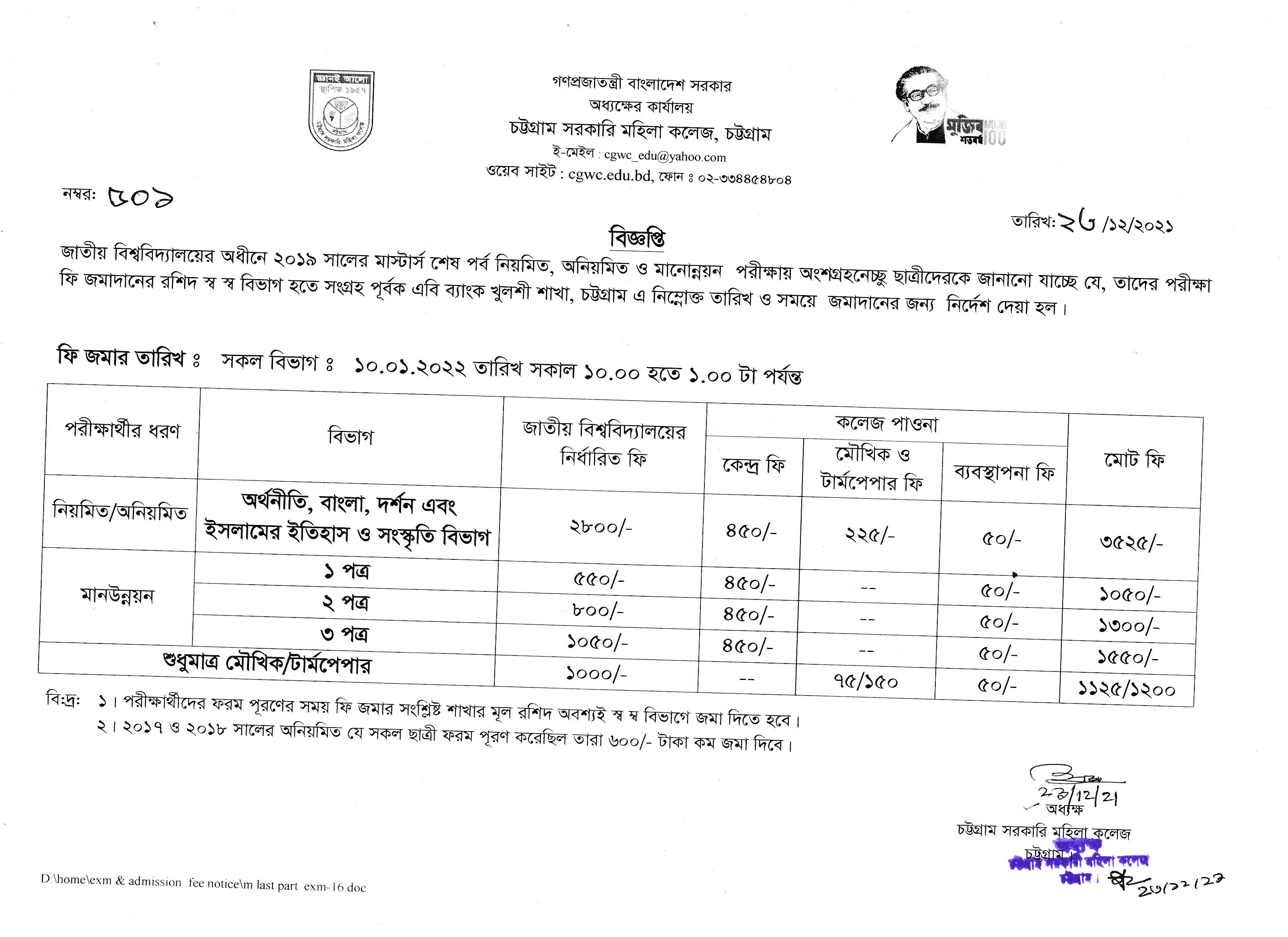 ২০১৯ সালের মাস্টার্স শেষ পর্ব নিয়মিত, অনিয়মিত ও মানোন্নয়ন পরীক্ষায় অংশগ্রহণেচ্ছু ছাত্রীদের ফরম পূরণের বিজ্ঞপ্তি প্রকাশ (২৩.১২.২০২১ খ্রিঃ)