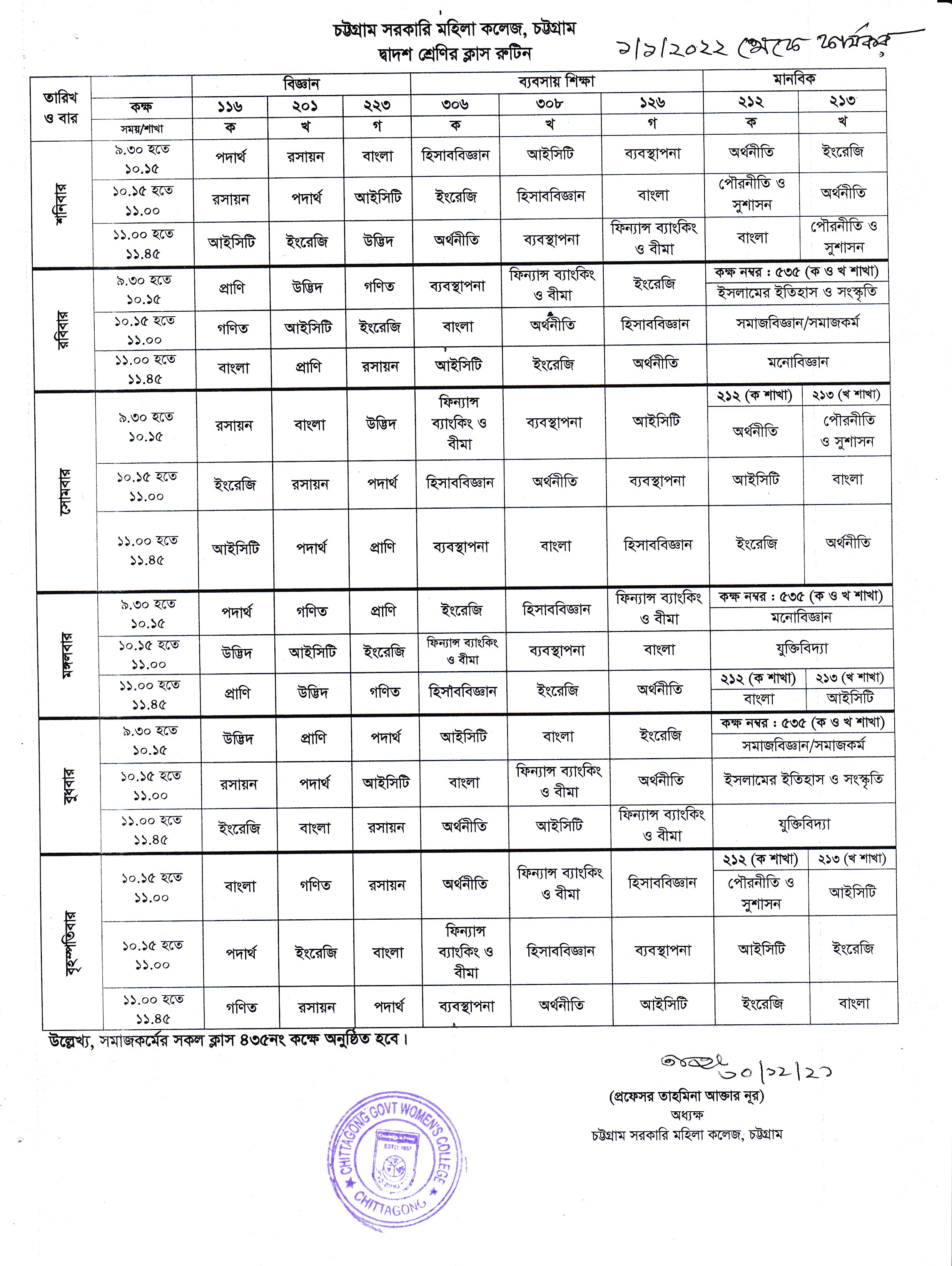 কলেজের দ্বাদশ শ্রেণির ক্লাস রুটিন প্রকাশ (৩০.১২.২০২১ খ্রিঃ)