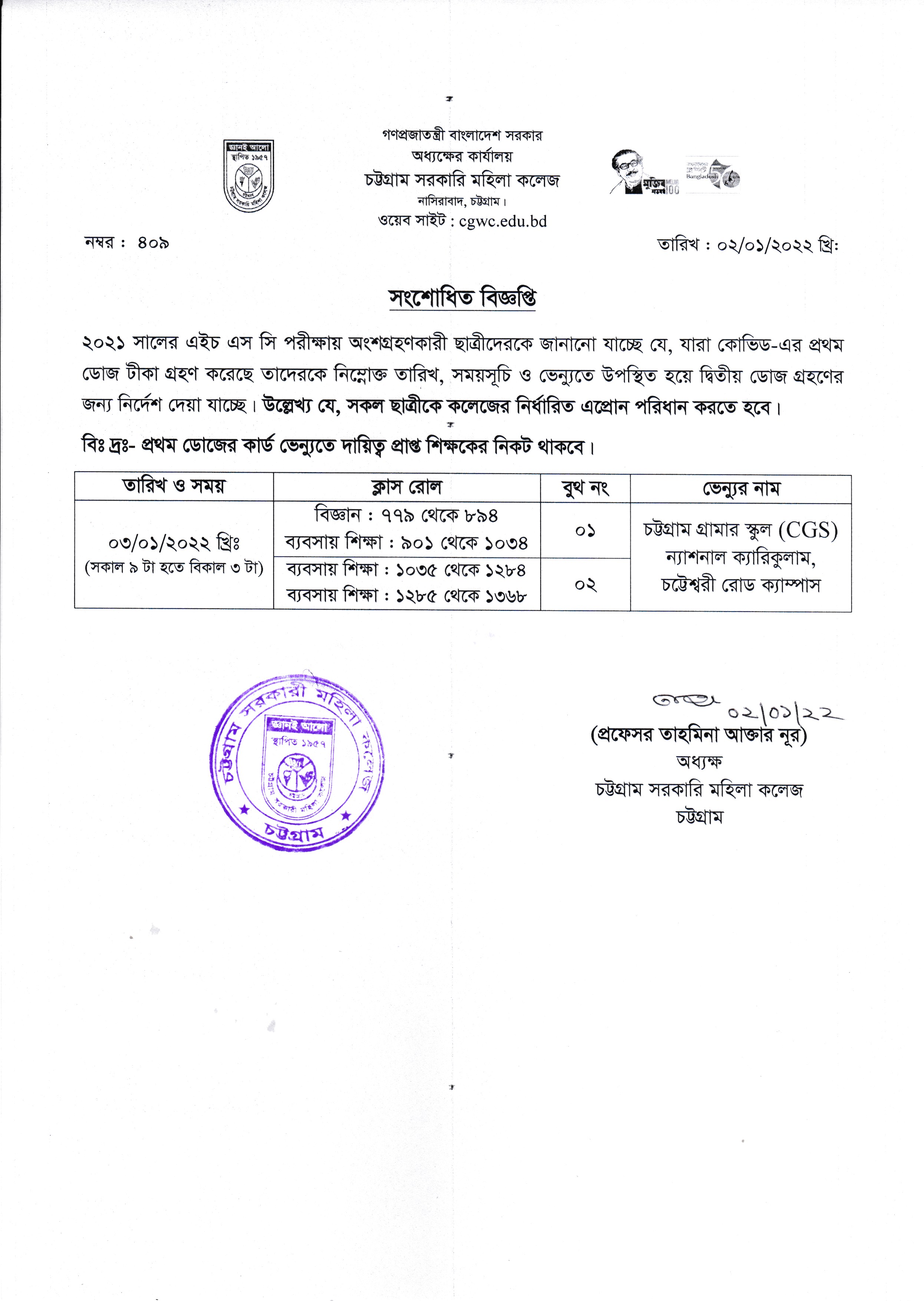 ২০২১ সালের উচ্চ মাধ্যমিক পরীক্ষায় অংশগ্রহণকারী ছাত্রীদের কোভিড -১৯ টিকার ২য় ডোজ প্রদানের বিজ্ঞপ্তি (০২/০১/২০২২)