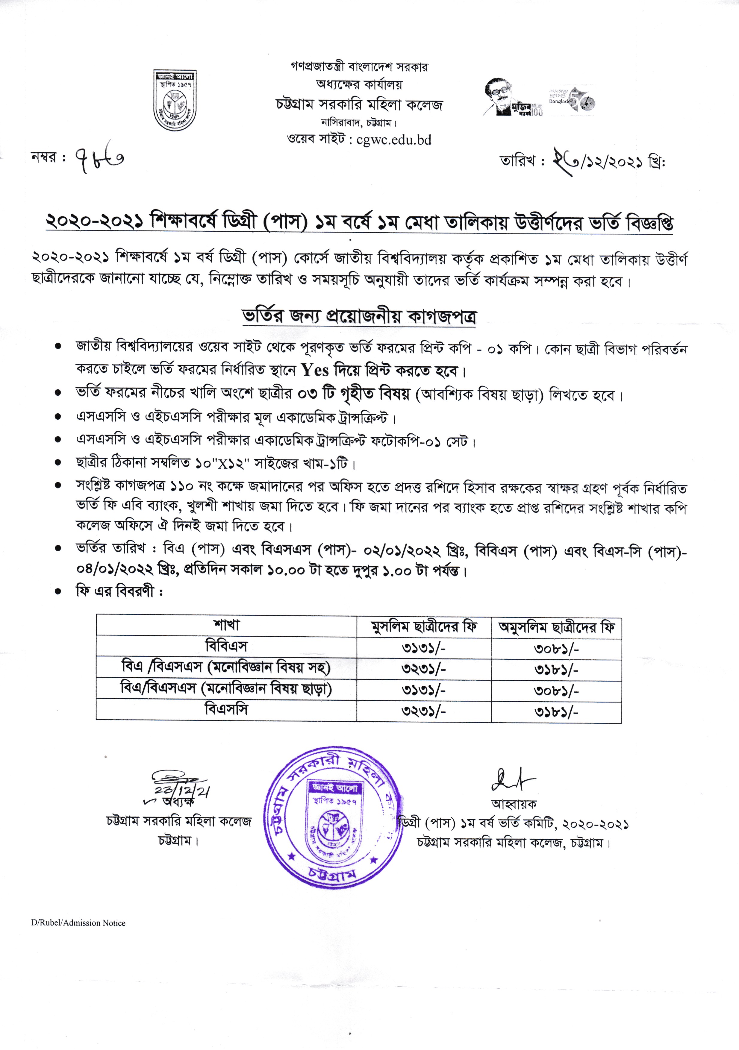 ২০২০-২০২১ শিক্ষাবর্ষে ডিগ্রি (পাস) ১ম বর্ষে ১ম মেধা তালিকায় উত্তীর্ণদের ভর্তি বিজ্ঞপ্তি প্রকাশ(২৬/১২/২০২১)