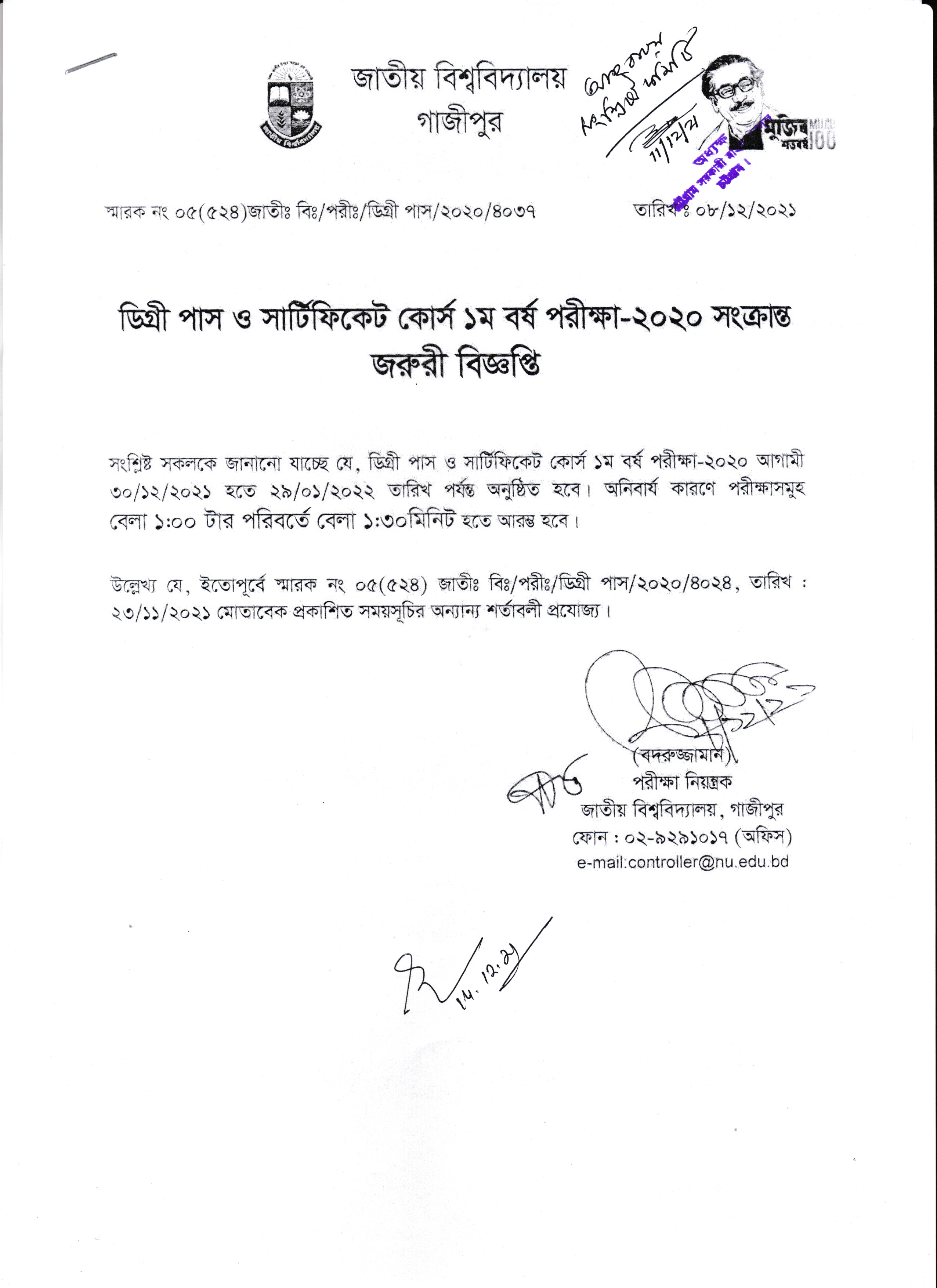 ডিগ্রি (পাস) কোর্স ১ম বর্ষ পরীক্ষা-২০২০ এর পরীক্ষা সংক্রান্ত জরুরী বিজ্ঞপ্তি (১৪/১২/২০২১)
