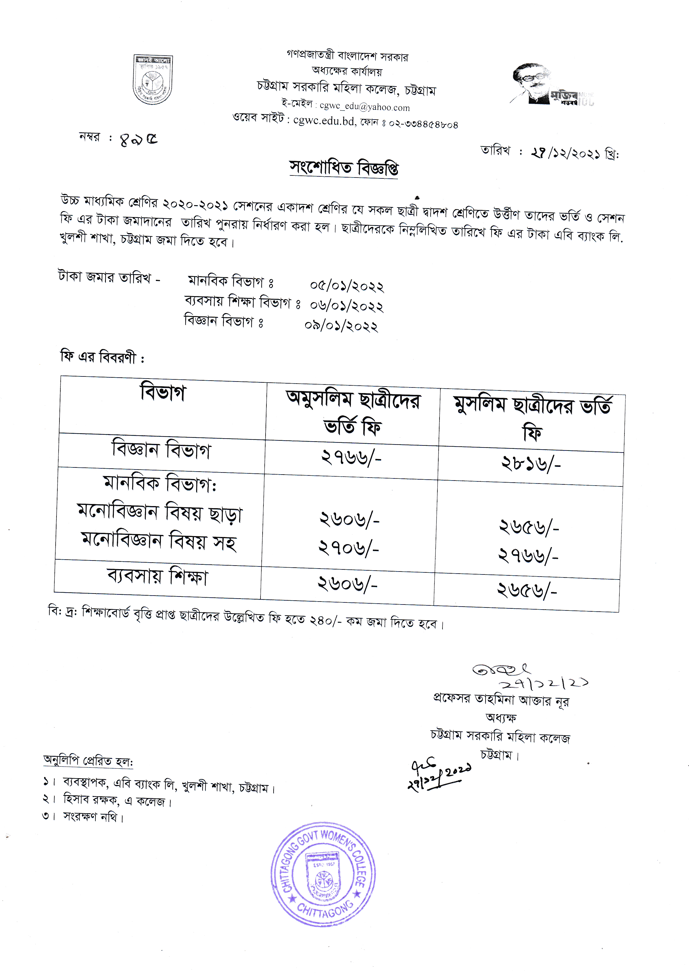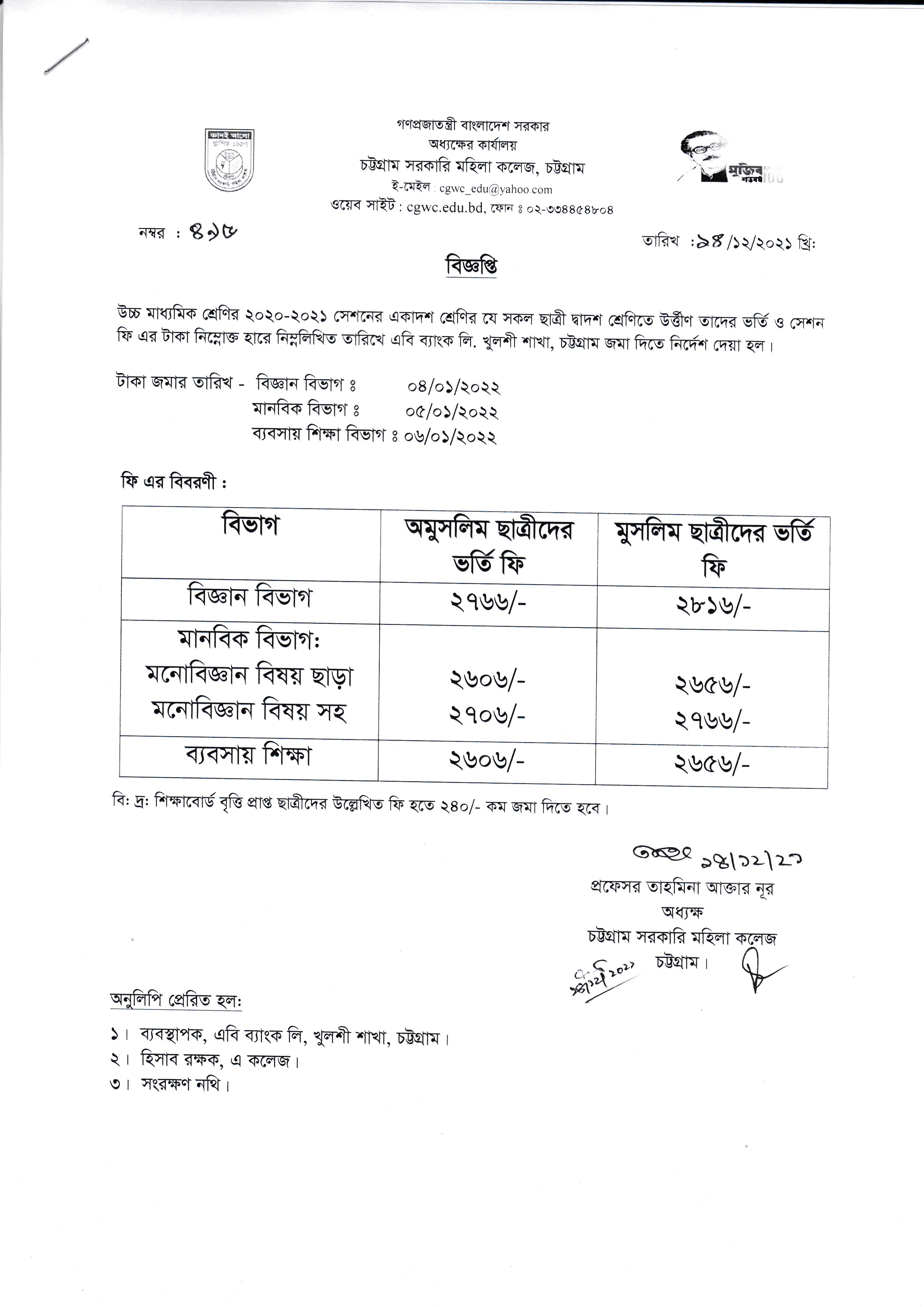 ২০২০-২০২১ শিক্ষাবর্ষের একাদশ শ্রেণি হতে যে সকল ছাত্রী দ্বাদশ শ্রেণিতে উত্তীর্ণ হয়েছে তাদের ভর্তি বিজ্ঞপ্তি প্রকাশ (২৭.১২.২০২১ খ্রিঃ)