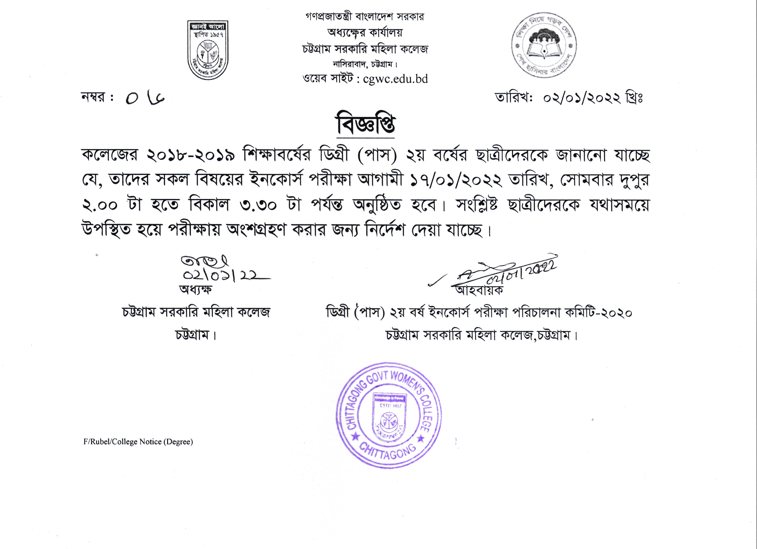 ২০১৮-২০১৯ শিক্ষাবর্ষের ডিগ্রি (পাস) ২য় বর্ষের ইনকোর্স পরীক্ষা সংক্রান্ত বিজ্ঞপ্তি (০২/০১/২০২২)