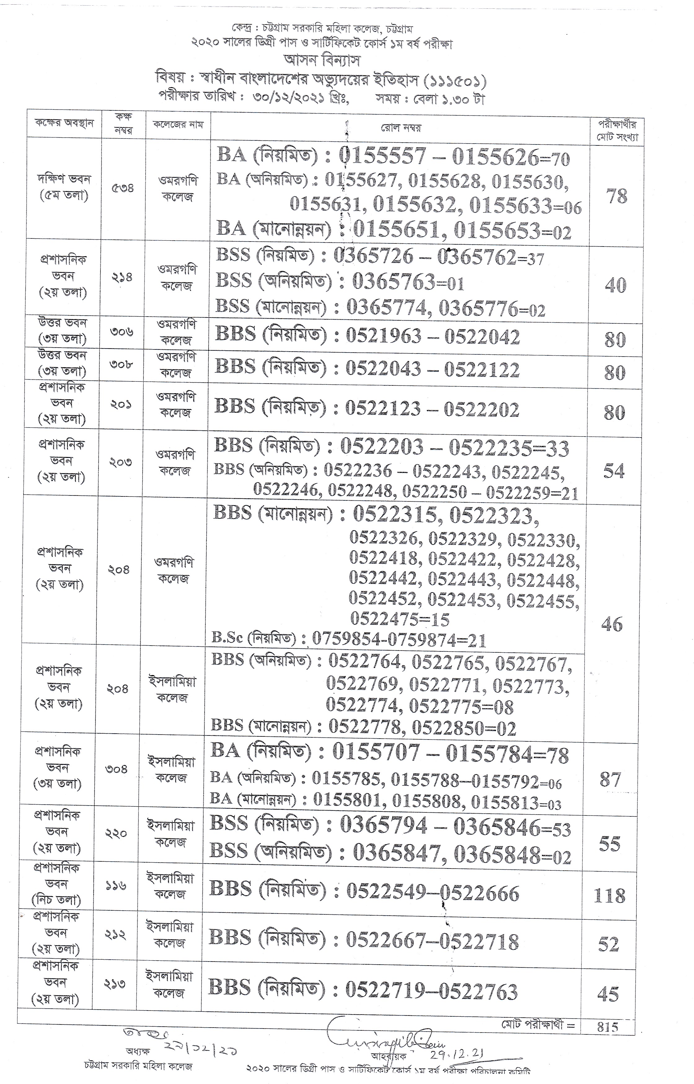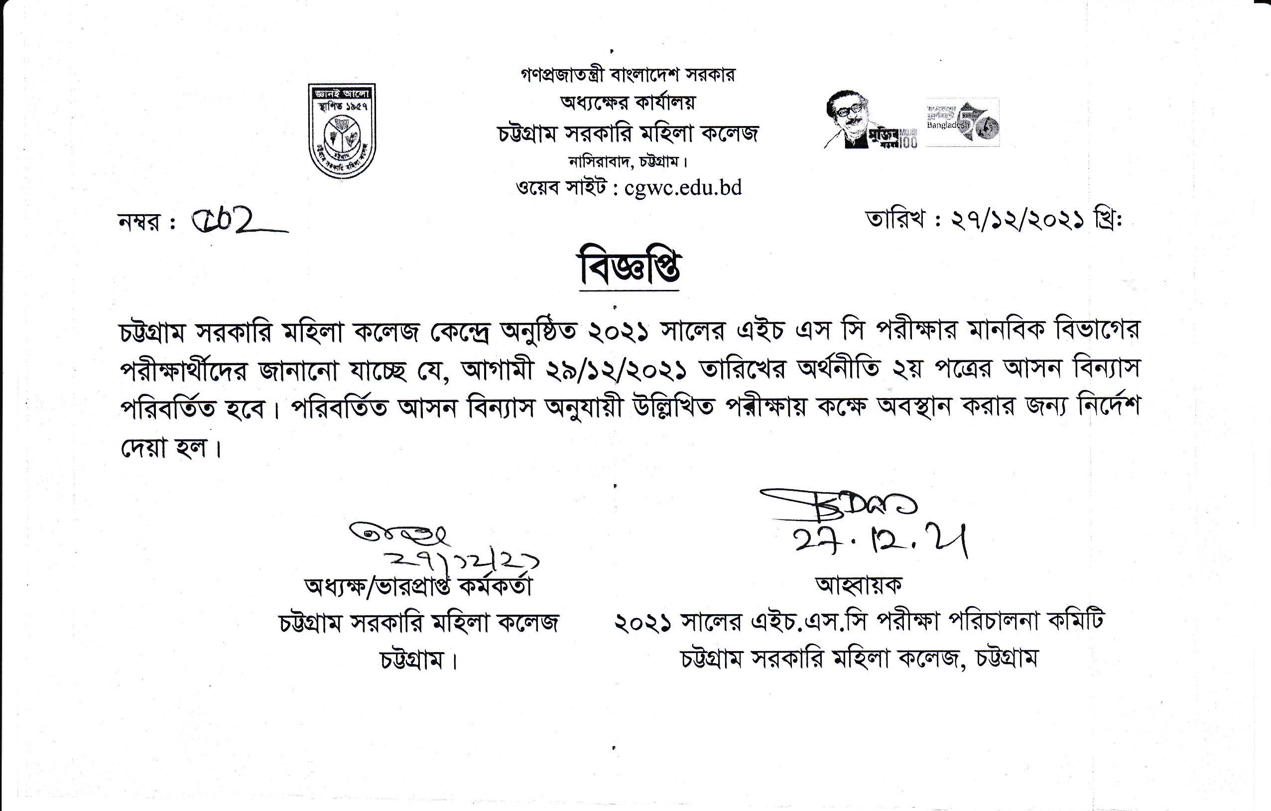 ২০২১ সালের এইচ এস সি পরীক্ষার মানবিক বিভাগের পরীক্ষার্থীদের আগামী ২৯/১২/২০২১ তারিখের আসন বিন্যাস পরিবর্তন সংক্রান্ত (২৭.১২.২০২১ খ্রিঃ)
