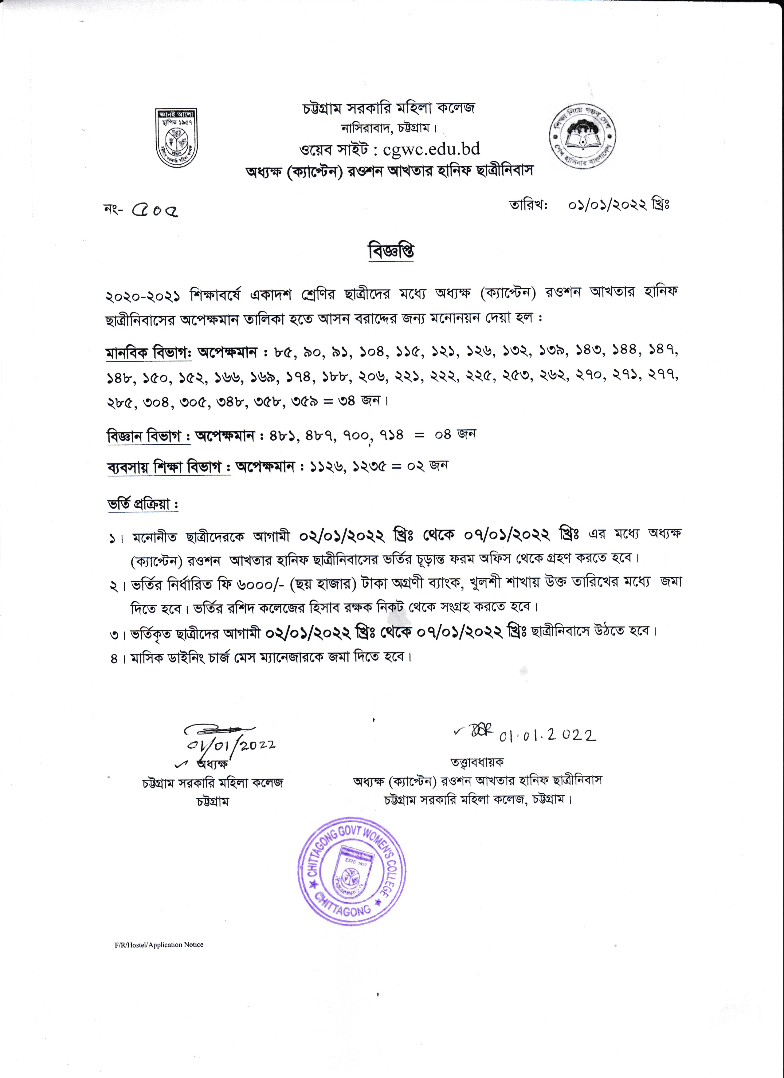 ২০২০-২০২১ শিক্ষাবর্ষে একাদশ/দ্বাদশ শ্রেণির ছাত্রীদের মধ্যে অধ্যক্ষ (ক্যাপ্টেন) রওশন আখতার হানিফ ছাত্রীনিবাসের অপেক্ষমান তালিকা হতে আসন বরাদ্দের বিজ্ঞপ্তি (০১/০১/২০২২)