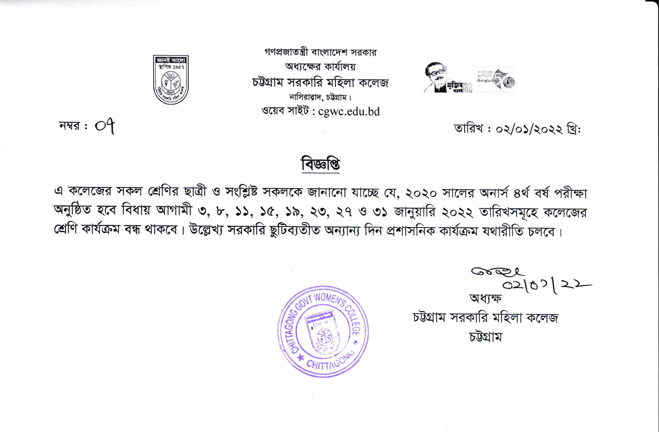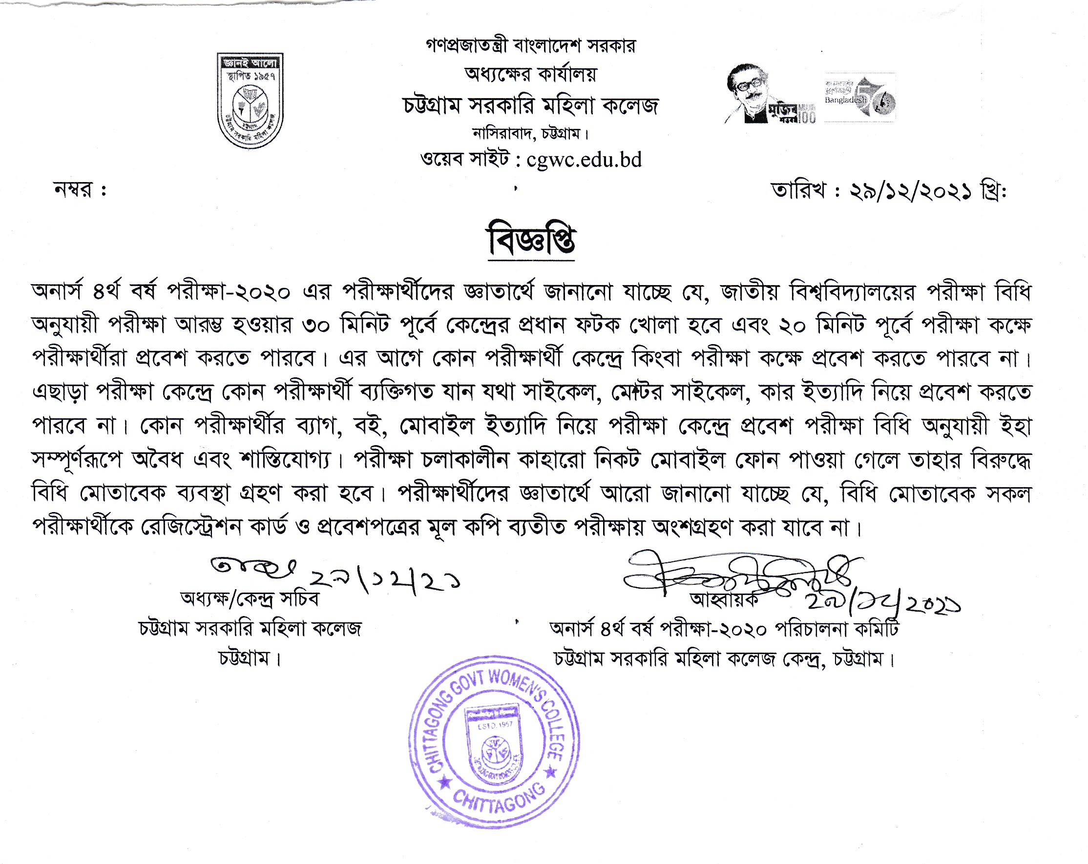 অনার্স ৪র্থ পরীক্ষা-২০২০ এর পরীক্ষার্থীদের জ্ঞাতার্থে বিজ্ঞপ্তি প্রকাশ (২৯.১২.২০২১ খ্রিঃ)