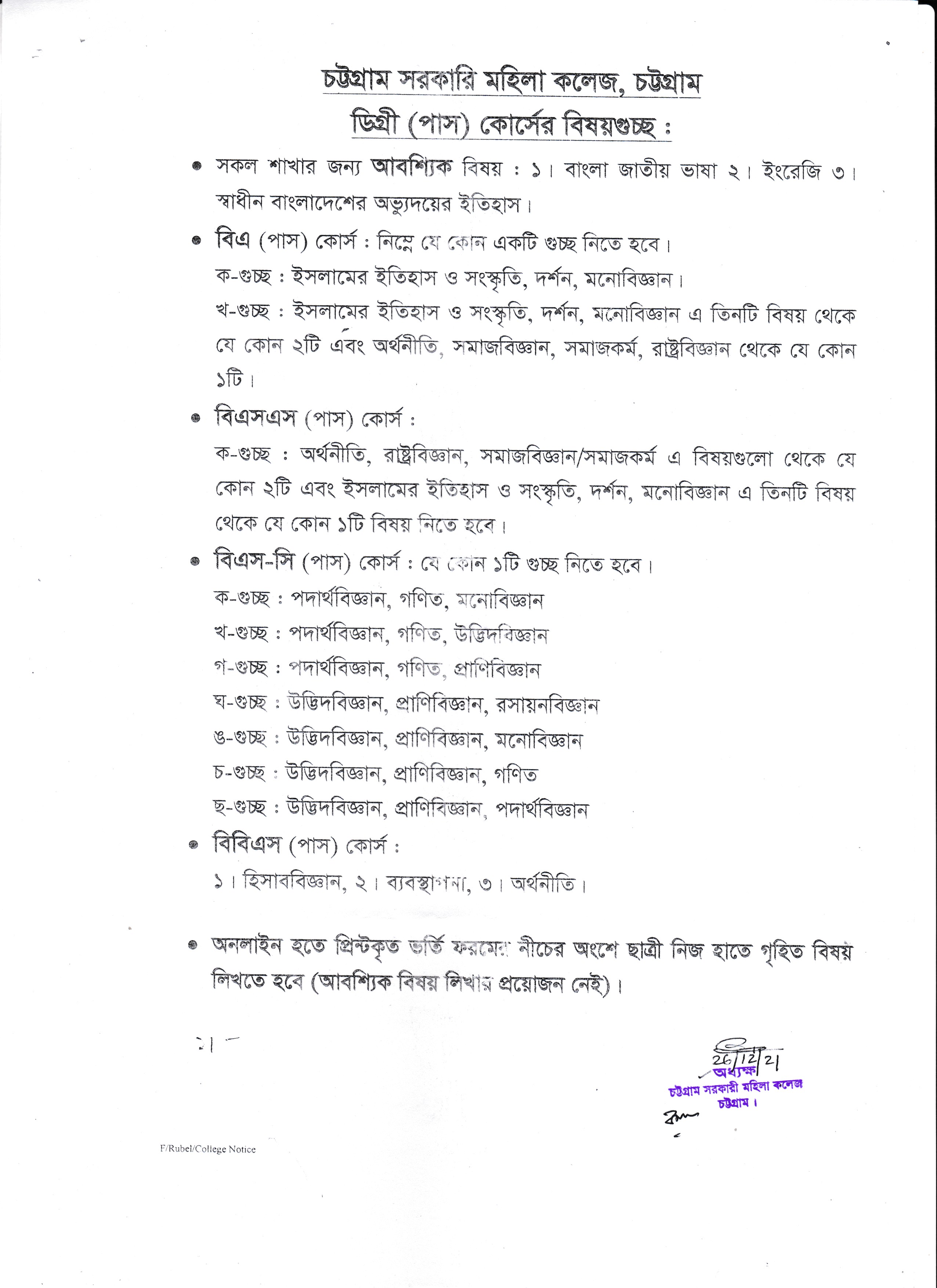 ২০২০-২০২১ শিক্ষাবর্ষে ডিগ্রি (পাস) ১ম বর্ষে ভর্তিচ্ছু ছাত্রীদের বিষয় তালিকা (২৬/১২/২০২১)