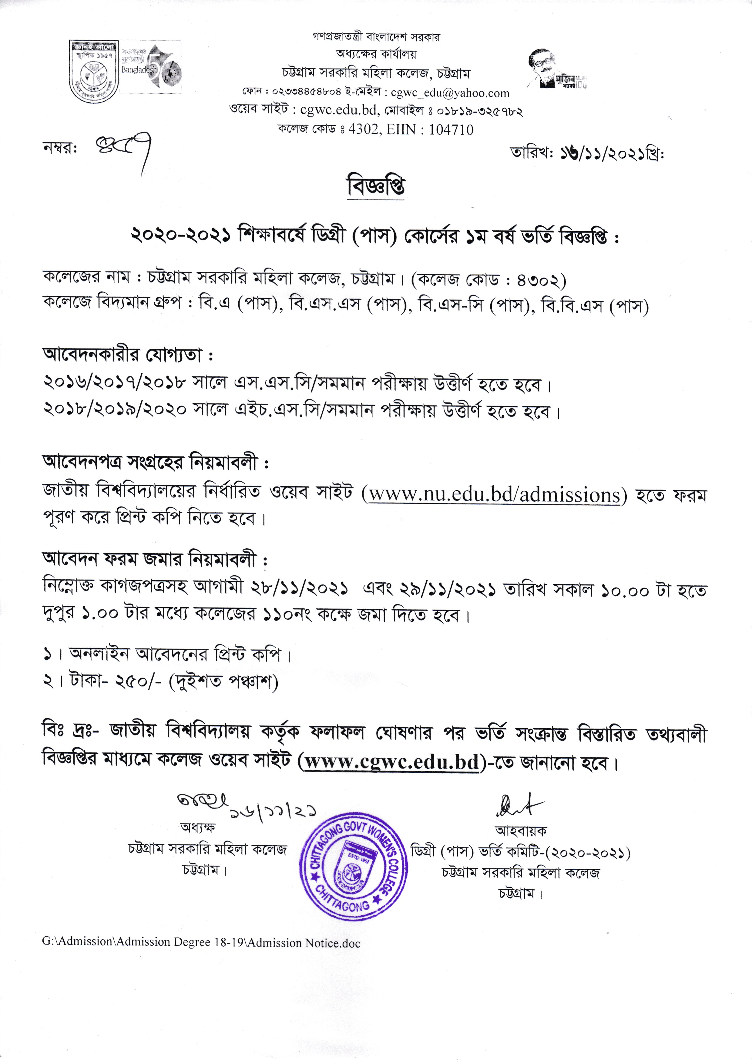২০২০-২০২১ শিক্ষাবর্ষে ডিগ্রি (পাস) কোর্সে ১ম বর্ষ ভর্তির আবেদন সংক্রান্ত বিজ্ঞপ্তি (১৬/১১/২০২১)