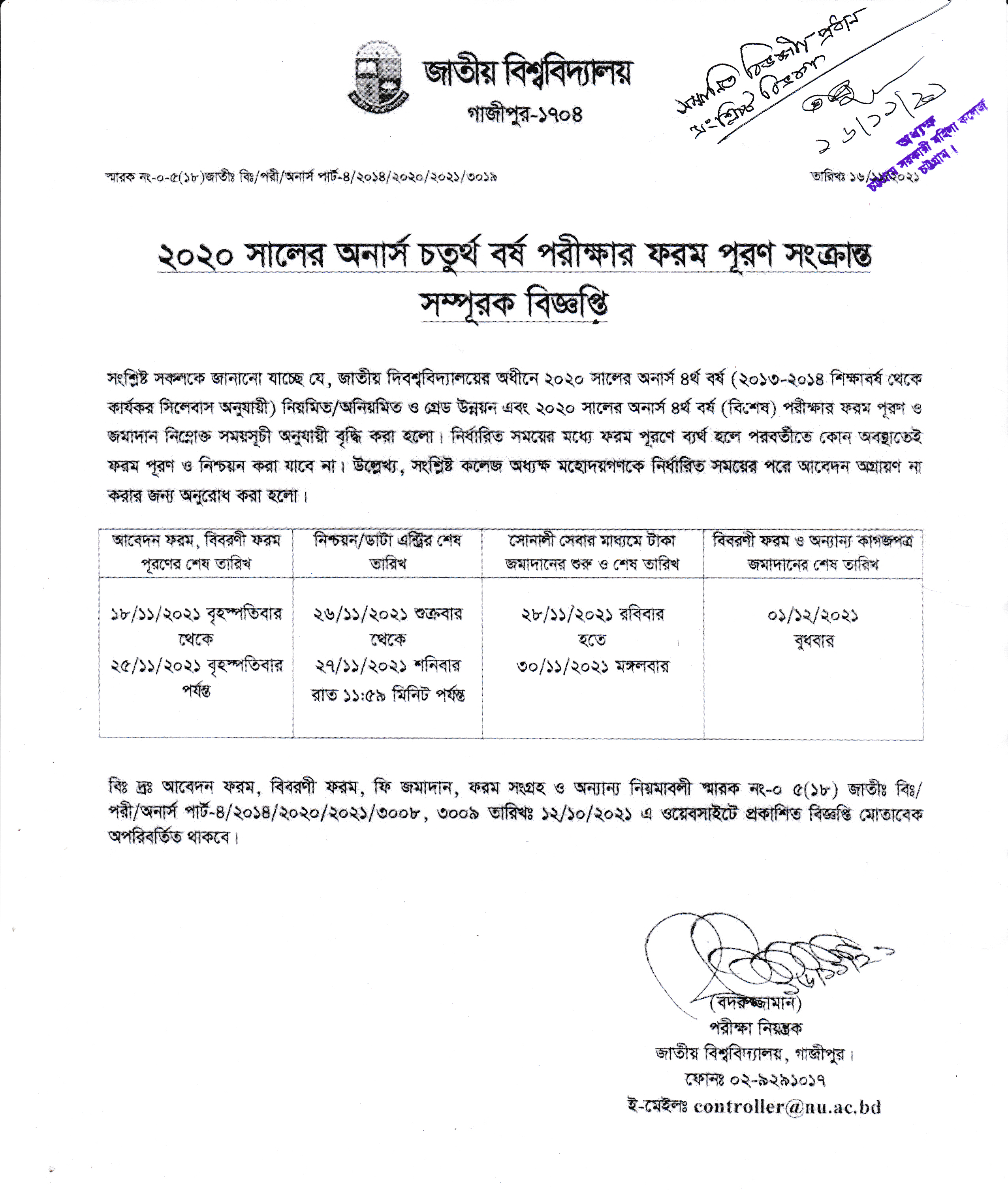 ২০২০ সালের অনার্স ৪র্থ বর্ষ পরীক্ষার ফরম পূরণ সংক্রান্ত সম্পূরক বিজ্ঞপ্তি প্রকাশ (১৭.১১.২০২১ খ্রিঃ)