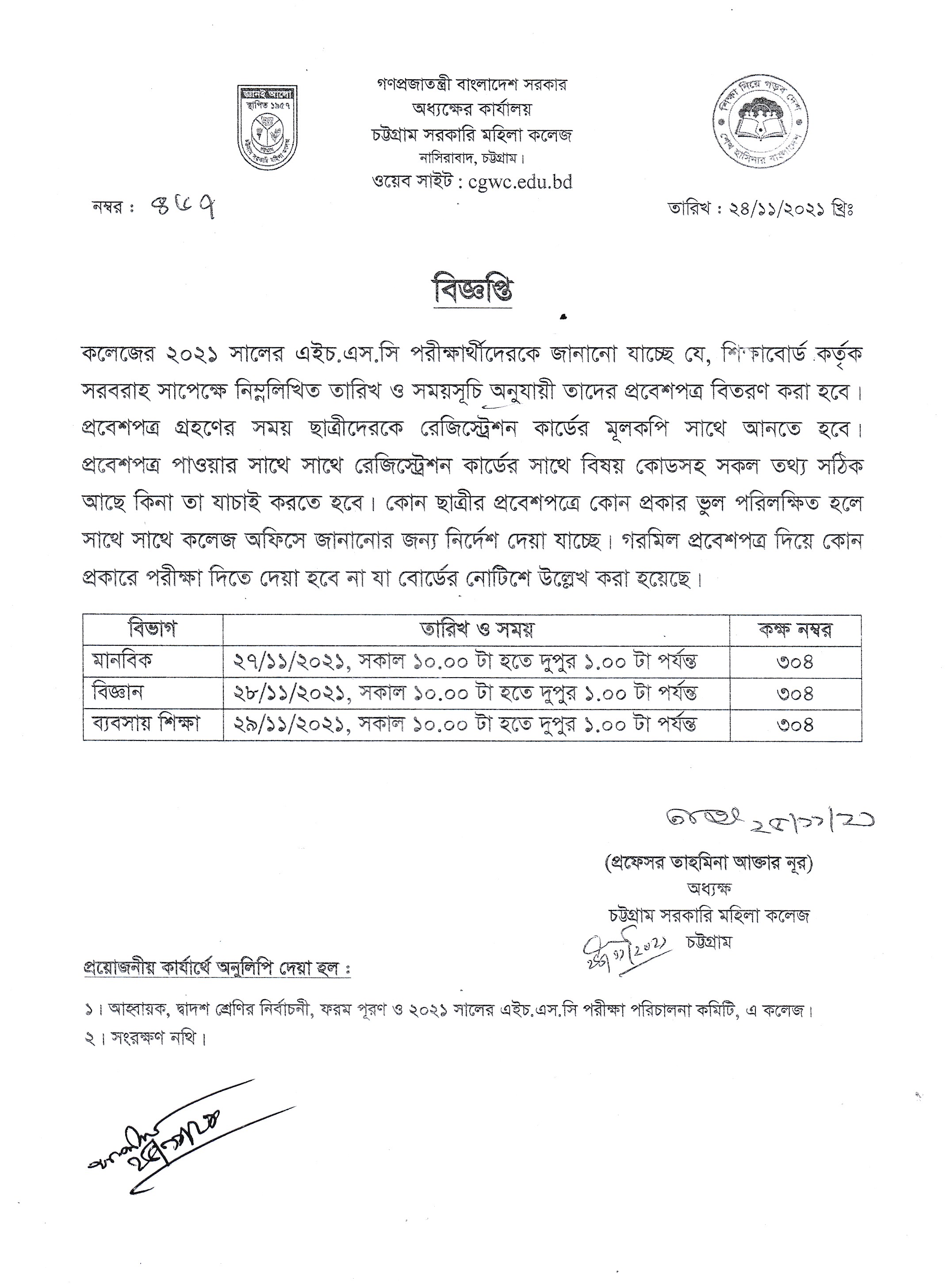 ২০২১ সালের এইচ.এস.সি পরীক্ষার্থীদের প্রবেশপত্র বিতরণের তারিখ ও সময়সূচি প্রকাশ (২৫.১১.২০২১ খ্রিঃ)