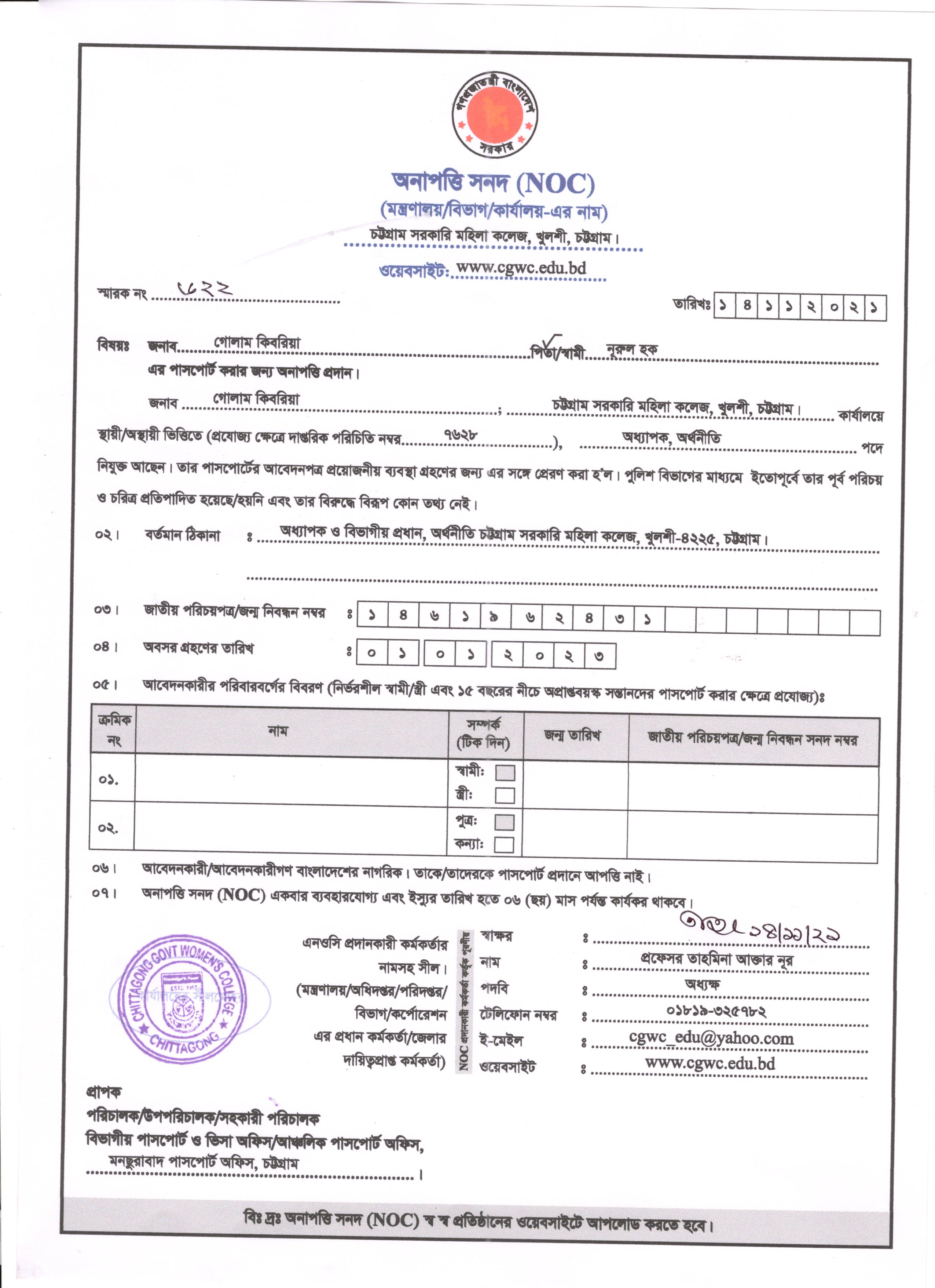 গোলাম কিবরিয়া, অধ্যাপক, অর্থনীতি এর NOC ফরম
