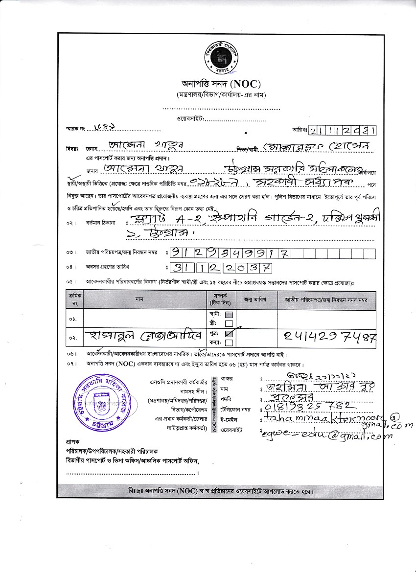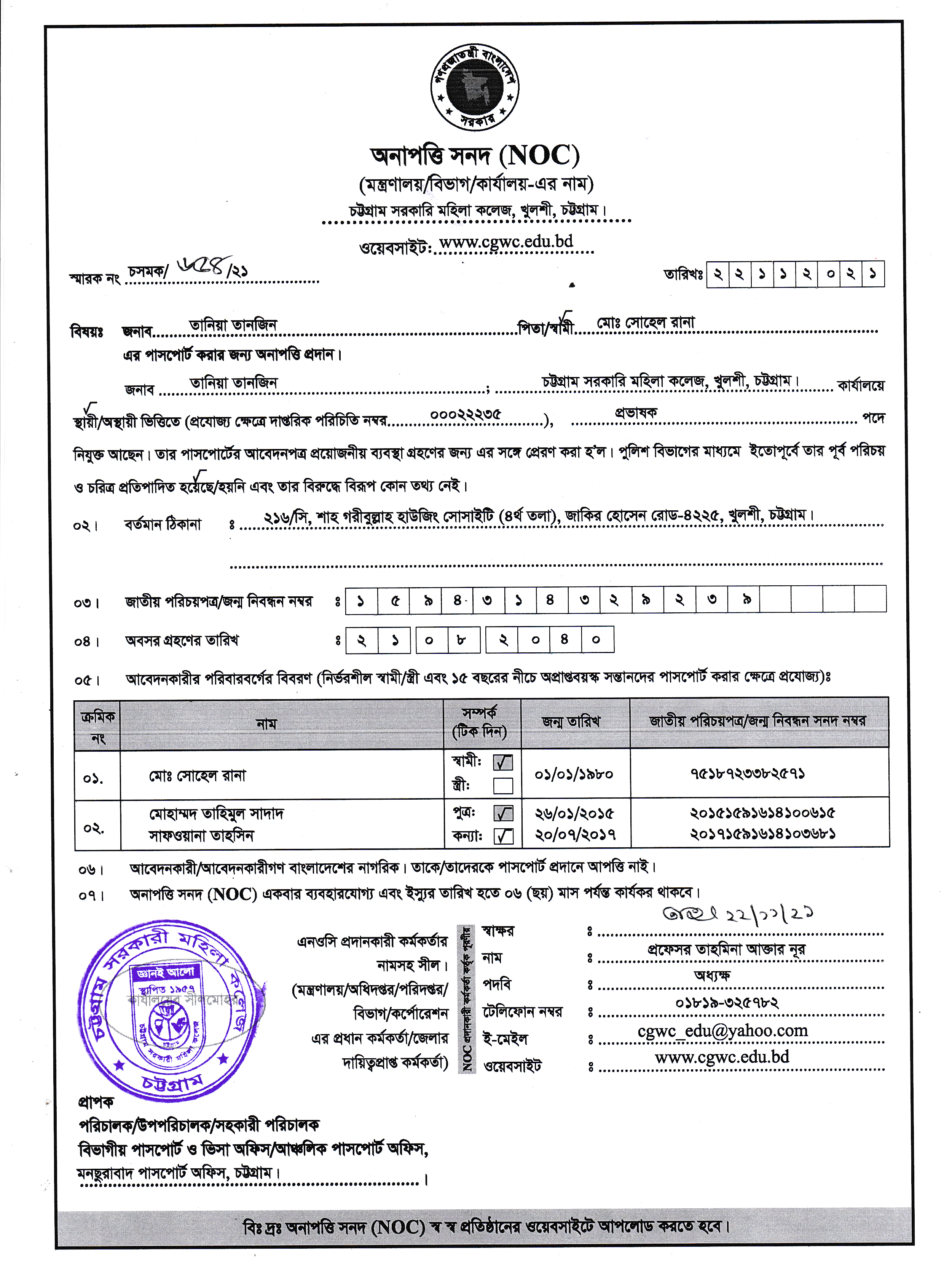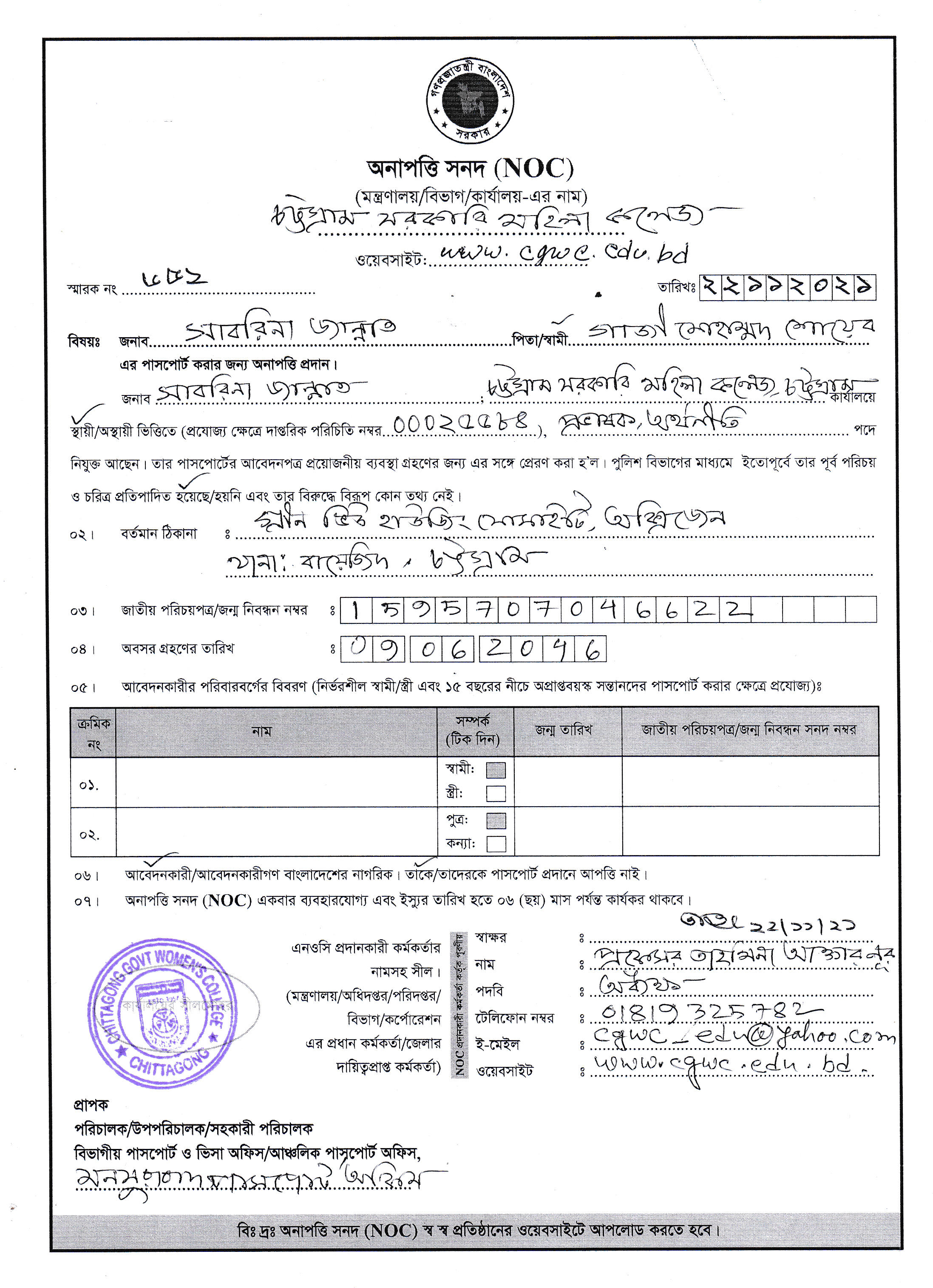 জনাব তানিয়া তানজিন, প্রভাষক, ইস.ইতি ও সংস্কৃতি এর NOC ফরম