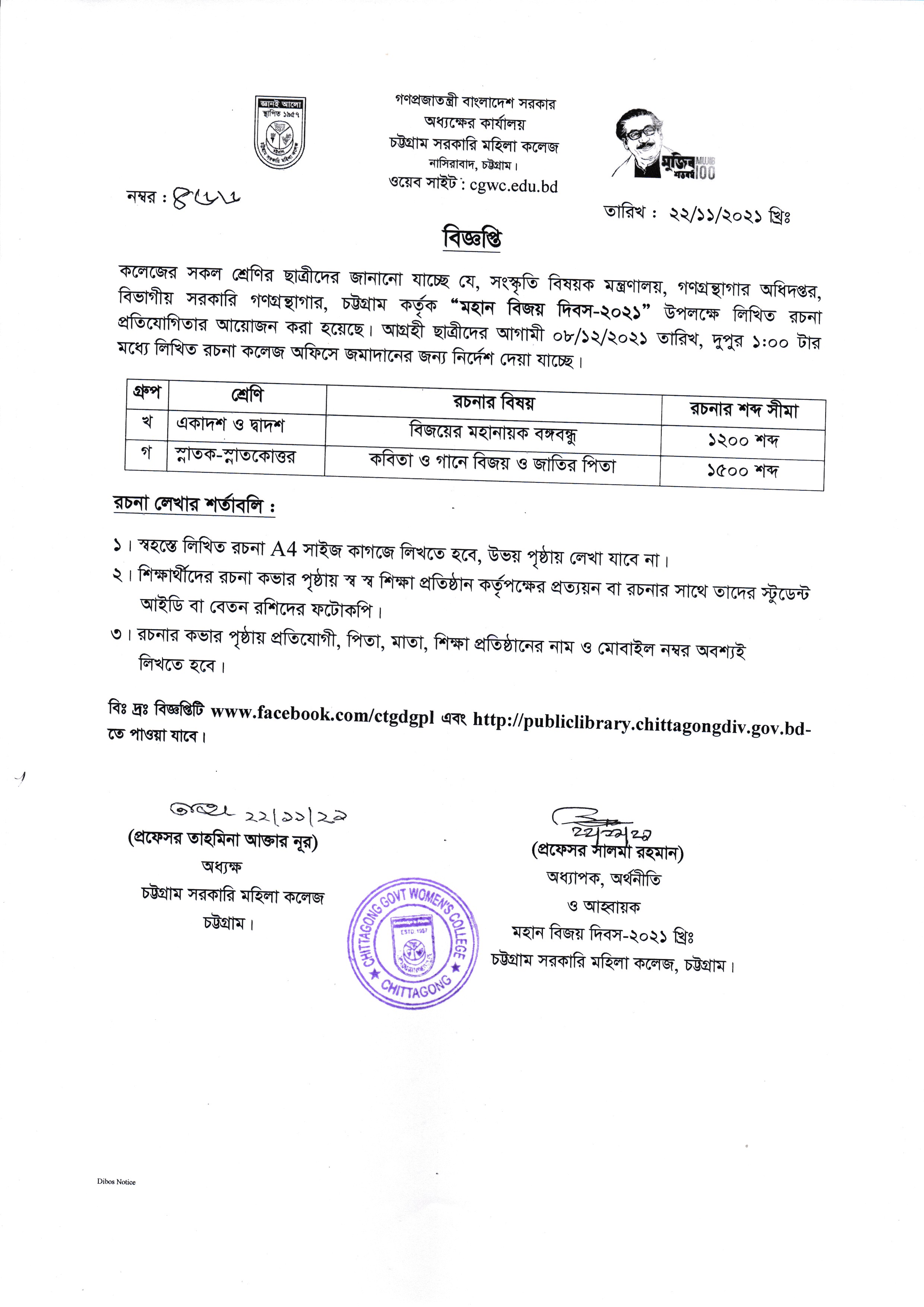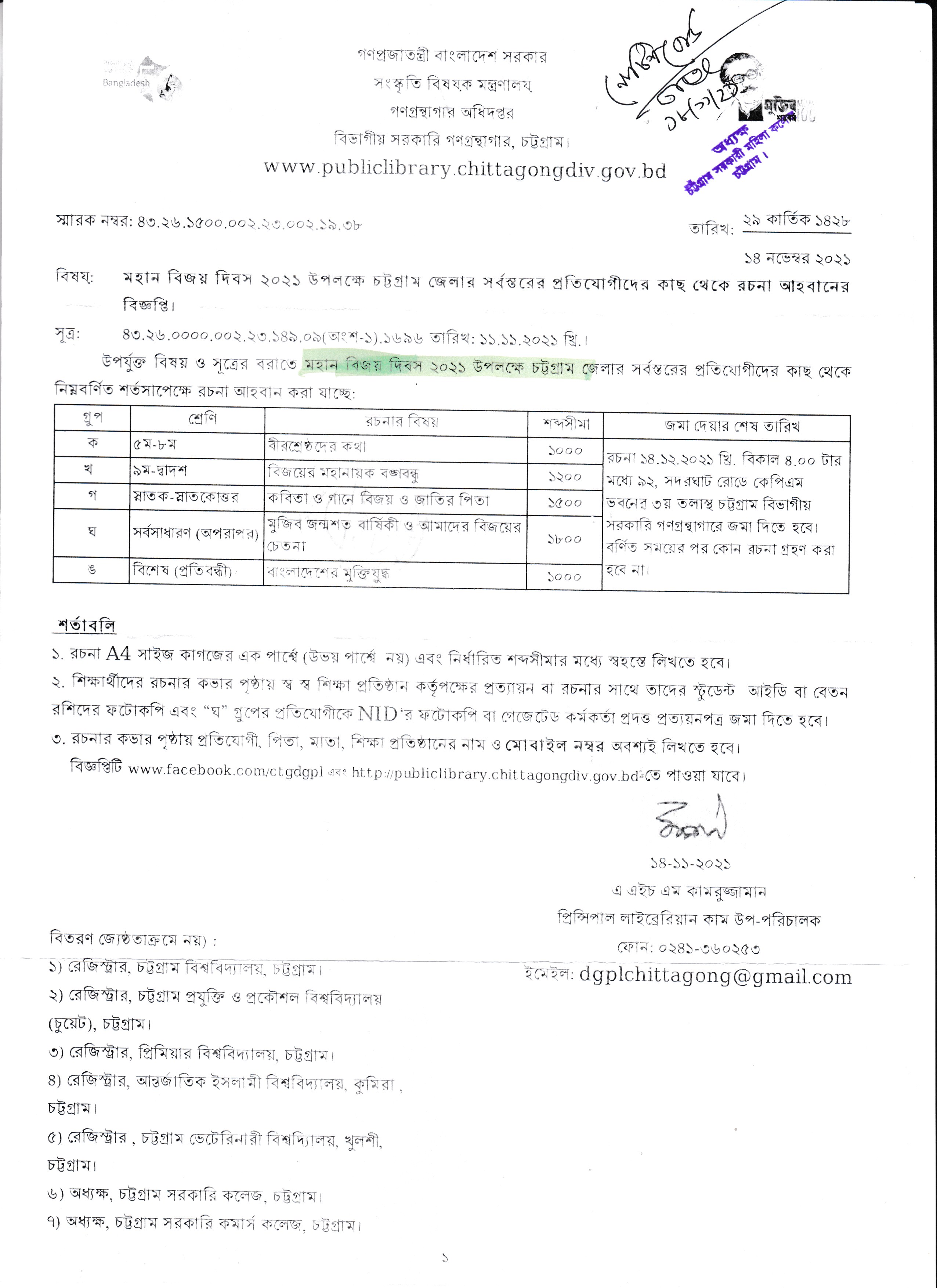 মহান বিজয় দিবস ২০২১ উপলক্ষে চট্টগ্রাম জেলার সর্বস্তরের প্রতিযোগীদের কাছ থেকে রচনা আহবানের বিজ্ঞপ্তি (১৮/১১/২০২১)