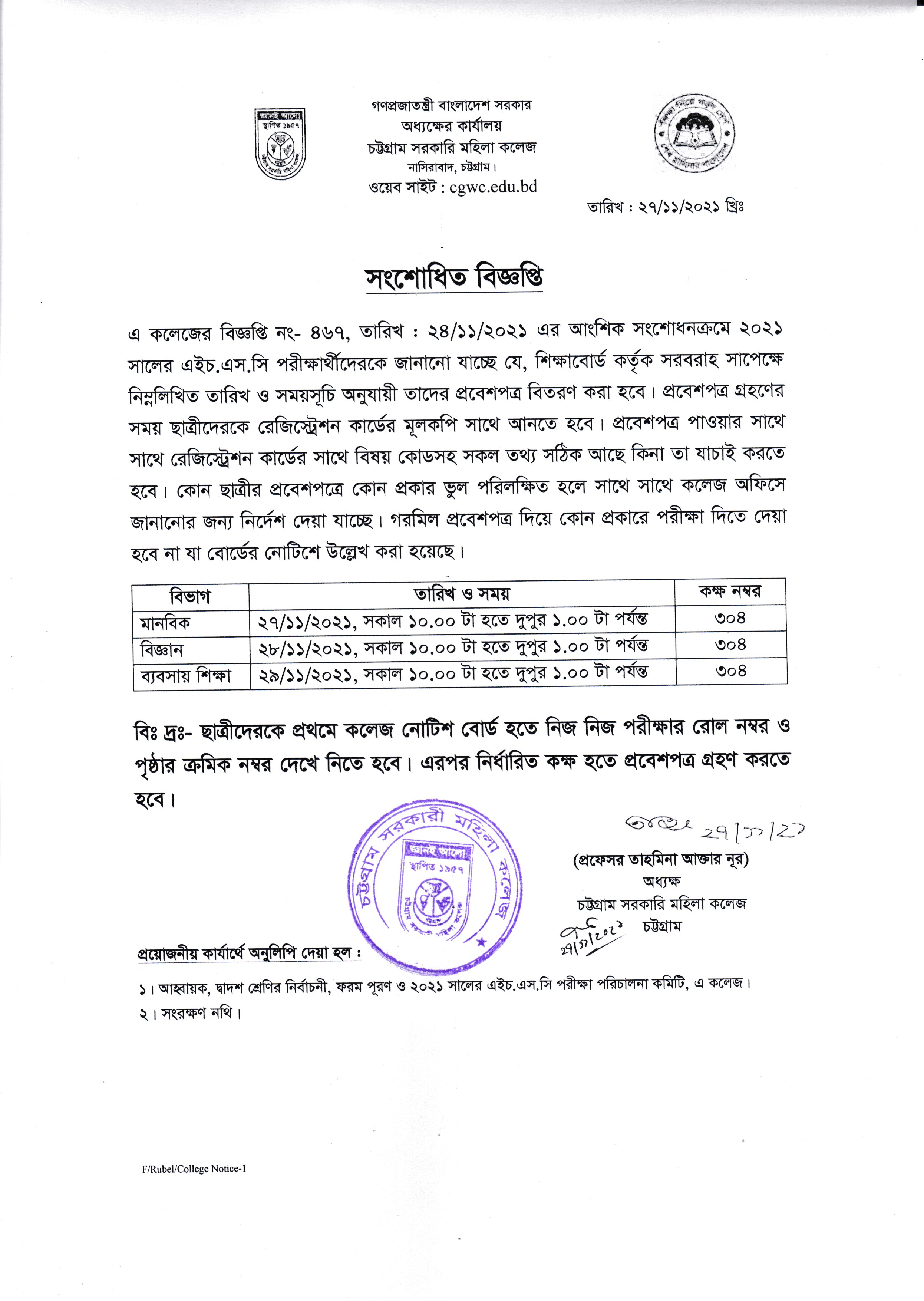 ২০২১ সালের এইচ.এস.সি পরীক্ষার্থীদের প্রবেশপত্র বিতরণের সংশোধিত বিজ্ঞপ্তি (২৭/১১/২০২১)