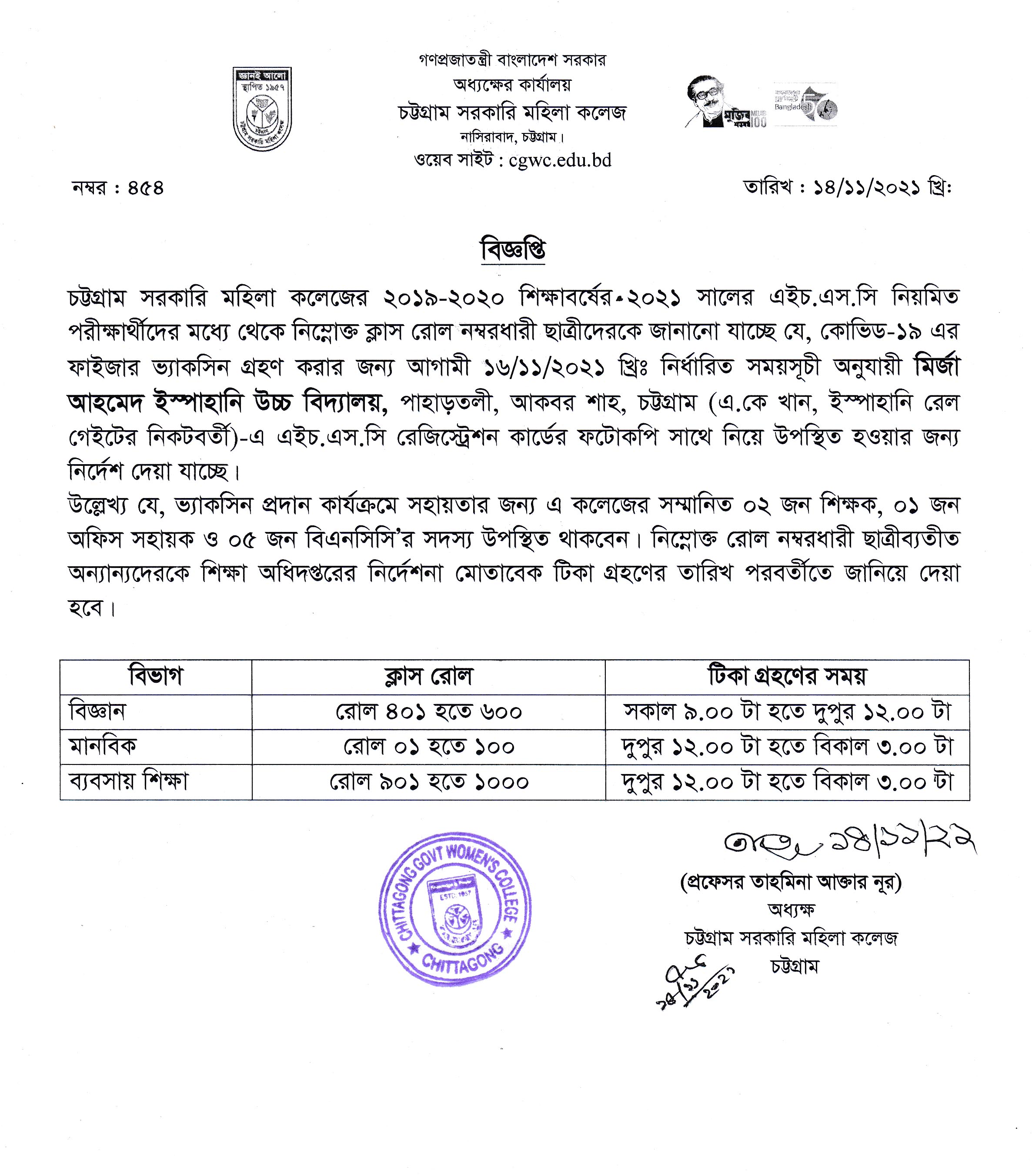 আগামী 17/11/2021 তারিখ সকাল 9.00 টা হতে 2021 সালের এইচএসসি পরীক্ষার্থীদের কোভিড 19 এর ভ্যাকসিন গ্রহনের জরুরী নোটিশ