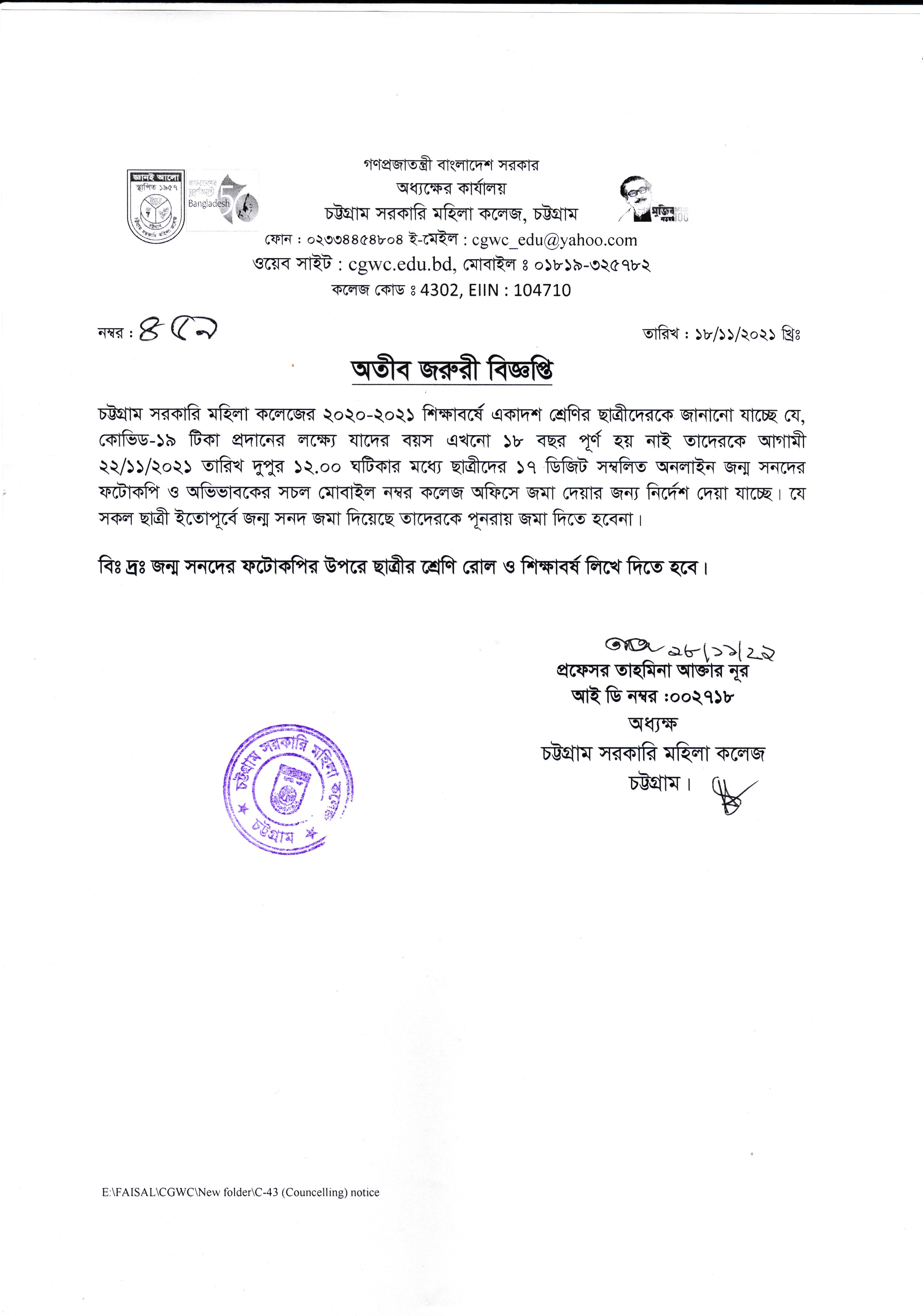২০২০-২০২১ শিক্ষাবর্ষেে একদশ শ্রেণির ছাত্রীদের যাদের বয়স এখনো ১৮ বছর পূর্ণ হয় নাই তাদের জন্ম সনদ জমা দেয়ার বিজ্ঞপ্তি (১৮/১১/২০২১)